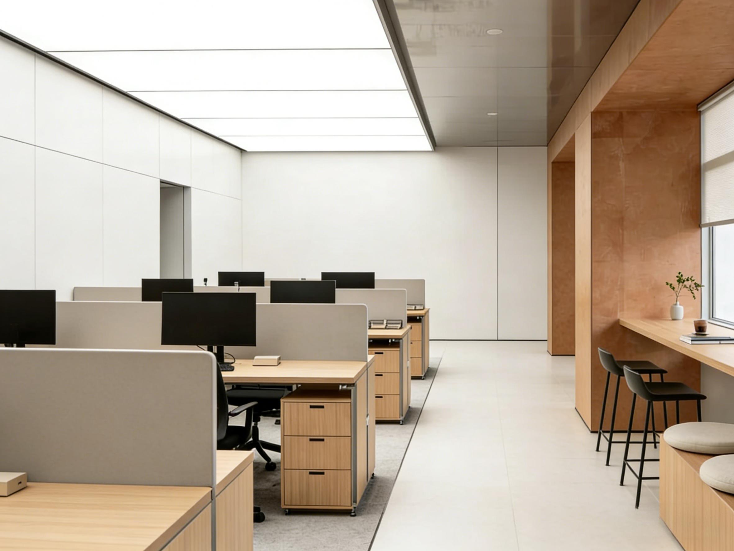 我们拒绝千篇一律的模板化设计,坚持因地制宜、因企定制。无论是现代简约风、轻奢商务风,还是融合人文气息的多元风格,壹西格玛团队都能精准拿捏。摒弃繁杂堆砌,偏爱用低饱和度色调、天然质感材质打造通透舒展的氛围,暖木肌理、细腻水磨石、柔光饰面相互映衬,搭配无眩光线性灯光与软膜照明,弱化办公空间的冰冷压抑,让职场兼具专业气场与治愈温度。