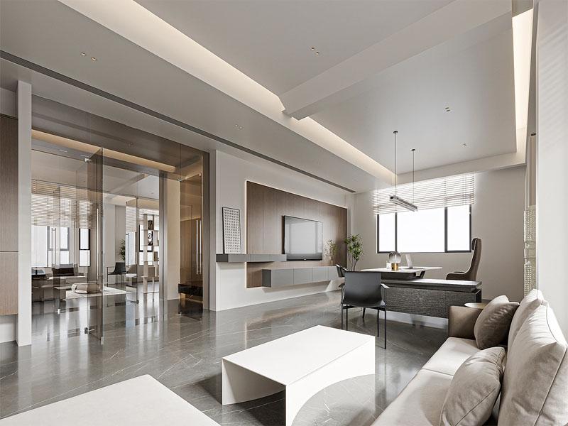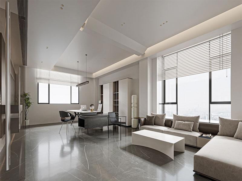 本项目落地于成都核心区域,整体设计摒弃繁复装饰,以 “简约、通透、高级” 为核心思路,打造出层次丰富且动线清晰的办公环境。空间整体采用浅色系为主调,浅灰大理石地面搭配米白墙面,辅以深木色柜体与金属线条点缀,冷暖交织间尽显高级质感。大面积落地窗的运用,让自然光线充分涌入空间,不仅提升了环境的明亮度,更让办公者在工作中能感受城市风光,舒缓视觉与心理压力。
