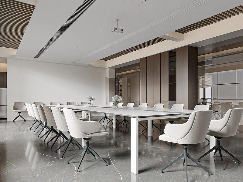 办公区域的规划充分考量实用性与协作性。开放办公区采用模块化布局,白色简约办公桌搭配轻量化办公椅,既保证了员工的独立工作空间,又通过合理间距预留出协作区域;悬浮式吊灯与隐形线槽设计,让顶面线条更简洁利落,同时兼顾照明与线路收纳需求。独立会议室采用玻璃隔断与实体墙面结合的方式,既保证了空间的通透感,又通过隔音处理保障会议私密性,长桌式布局搭配舒适座椅,满足多人会议、商务洽谈等多元需求。