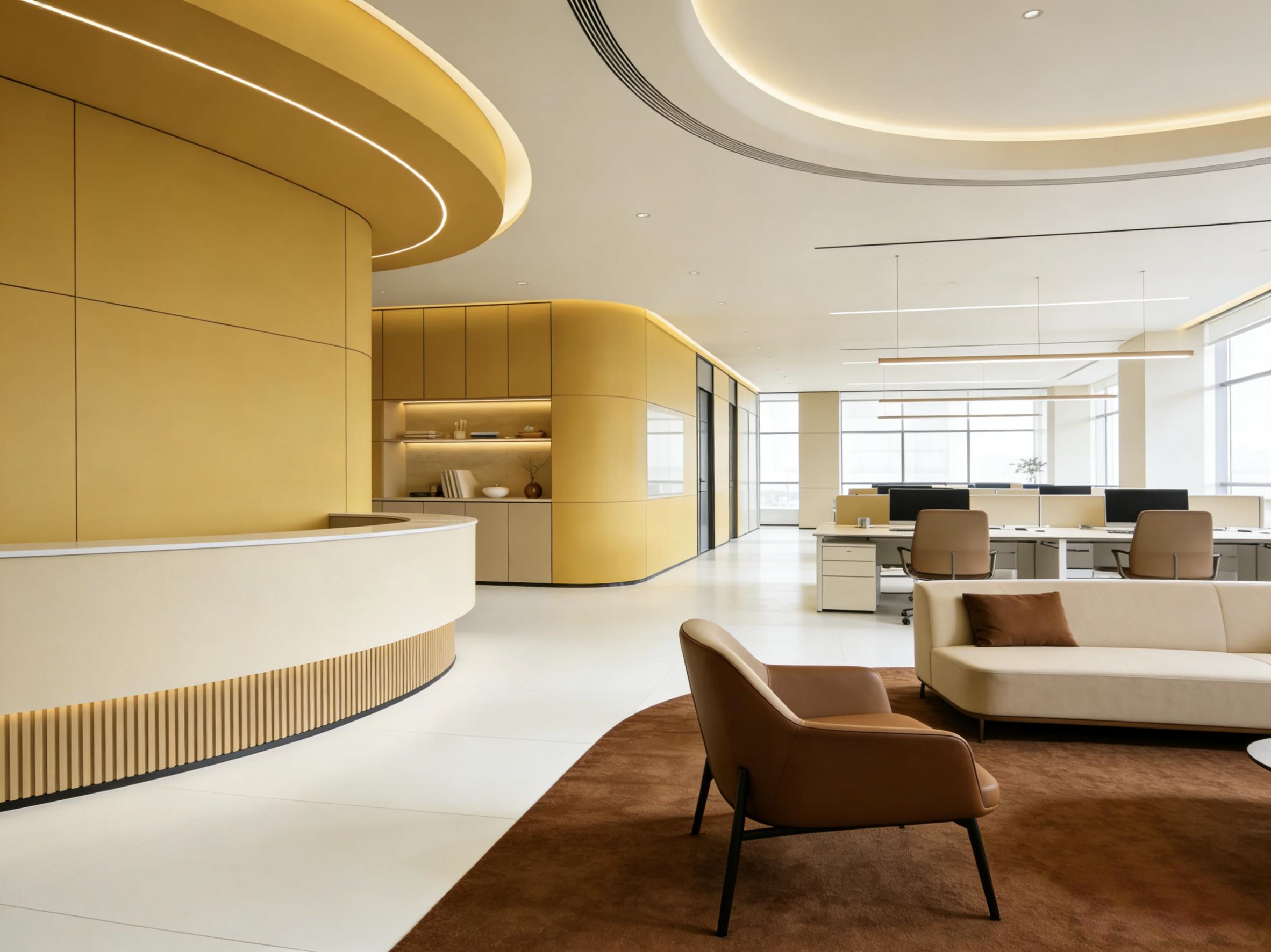 - 暖黄色弧形墙面与柜体作为视觉焦点,打破了传统办公空间的冰冷感,传递出活力与亲和力;