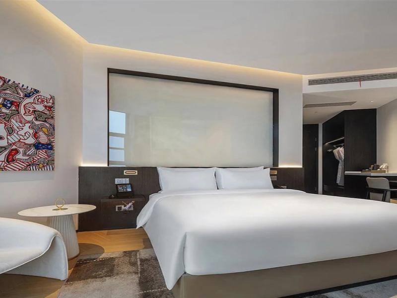 900平米的空间不算阔绰,却在成都成华区酒店设计团队的精妙规划下,实现了功能区的极致利用,没有丝毫冗余与拥挤感。整个空间以温暖木饰面为基底,搭配柔和无主灯照明,天然木质纹理中和了都市空间的冰冷,嵌入式灯带与氛围灯错落排布,光线均匀温润,既避免强光直射的刺眼感,又营造出静谧松弛的入住氛围,让踏入空间的旅人瞬间卸下旅途疲惫,快速融入安逸的栖居氛围。