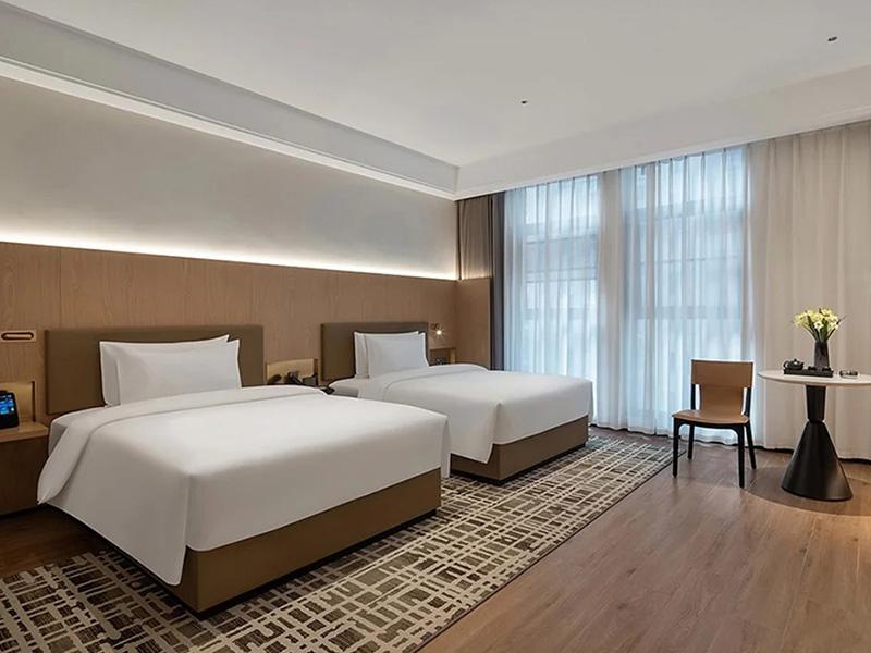 核心客房区域作为空间重点,延续整体简约调性,同时兼顾居住舒适度与私密性。无论是大床房还是双床房,都选用洁净柔软的白色床品,与浅棕木质墙面、地板形成温柔视觉对比,床头极简靠背搭配侧边智能控制面板,住客可轻松调控灯光、窗帘,实现便捷智能化入住体验。设计师巧妙利用900平米空间格局,合理划分每间客房面积,避免空间浪费,靠窗位置预留休闲角落,搭配简约桌椅与落地窗,白天引入充足自然光,可闲坐俯瞰成华区城市街景,夜晚伴着灯火静坐,独享片刻惬意。