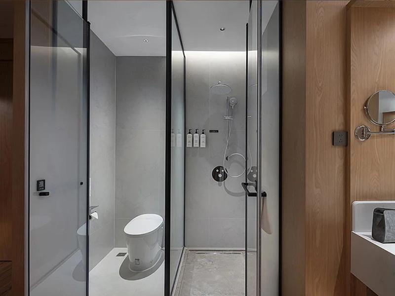 公共区域与卫浴空间的设计,同样彰显着成都成华区酒店设计的细节匠心。卫浴区采用玻璃隔断做干湿分离,通透材质不占用额外空间,浅灰色瓷砖搭配哑光黑色五金件,碰撞出低调高级感,嵌入式卫浴设备与整齐摆放的洗护用品,处处透着精致与规整。公共休闲区则用深灰色墙面、木质格栅与暖金色灯光搭配,营造沉稳大气的氛围,舒适沙发组合与简约软装,让这片区域兼具会客、休憩功能,适配商旅与休闲出行人群的多元需求。
