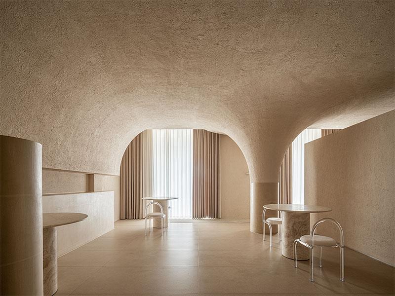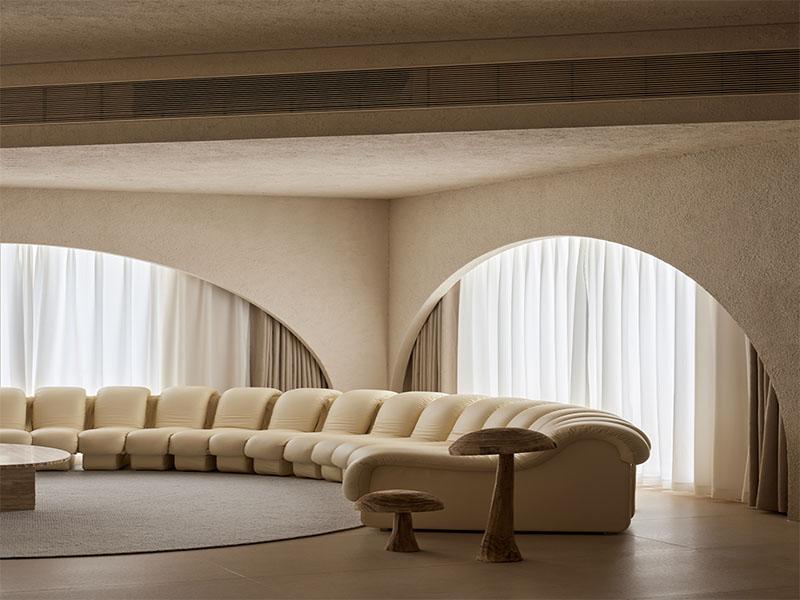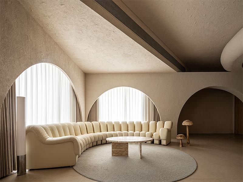 空间叙事上,我们以“洞穴”为核心概念,用大量弧形、拱形、圆润线条消解建筑棱角。从入口前厅的弧形立柱,到廊道拱顶,再到休憩区拱形窗景,层层递进、移步换景,让顾客从踏入空间开始,便完成从城市喧嚣到静谧疗愈的情绪过渡。动线规划遵循商业公装逻辑,接待、等候、过渡、理疗分区清晰,既保障客流顺畅,又最大化私密性,适配成都高端SPA客群对安静、私密的核心需求。