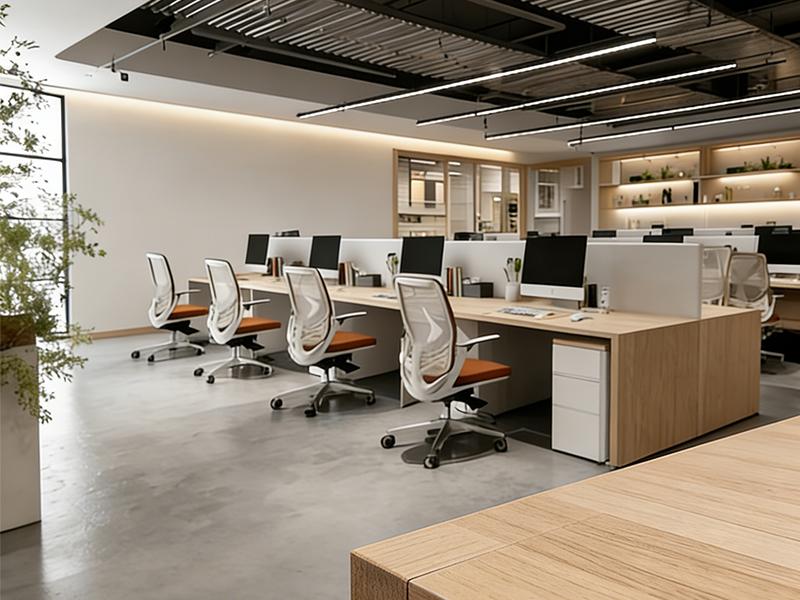 开放办公区是空间的核心,700㎡的尺度被合理规划为高效工位区。浅木色办公桌搭配白色收纳柜,既保证了储物需求,又让空间显得轻盈通透;裸露的工业风吊顶与线性灯带结合,在保留原始结构感的同时,营造出利落的办公氛围。大面积落地窗引入自然光线,搭配绿植点缀,让员工在忙碌中也能感受到自然的呼吸,有效缓解视觉疲劳。半高隔断的设计既保障了个人工作的专注度,又保留了团队协作的便捷性,实现了 “开放与私密” 的平衡。