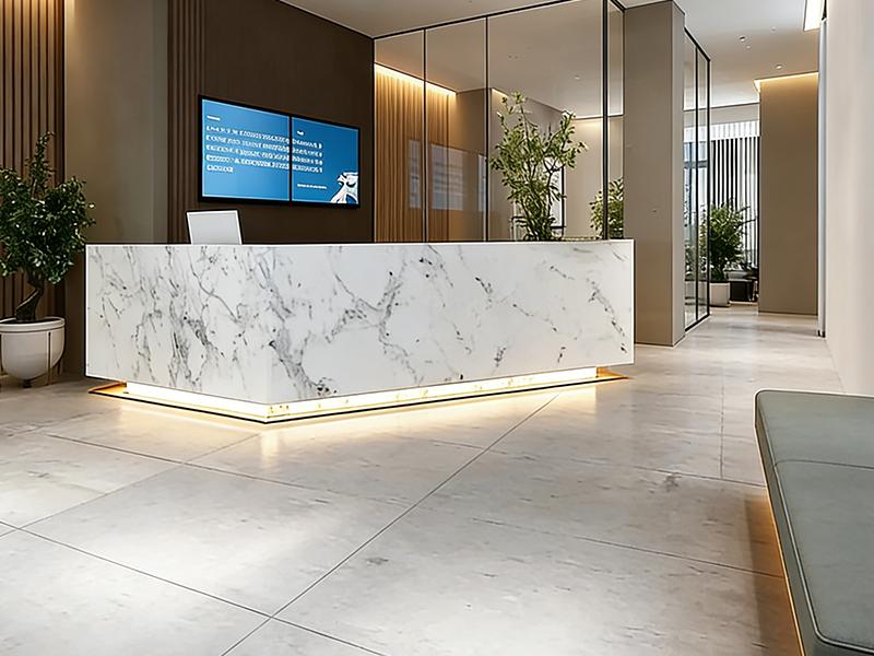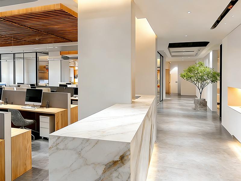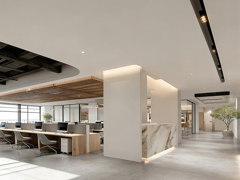 在细节设计上,空间处处体现着人性化考量:地面选用耐磨防滑的大理石与水泥质感地砖,兼顾美观与实用性;智能照明系统根据不同场景调节亮度,既节能又营造出舒适的光环境;绿植的合理布局不仅净化空气,更成为空间里的自然点缀,让办公环境更具生命力。