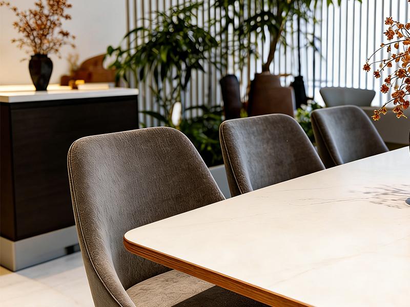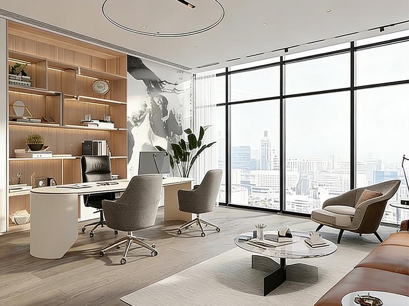 会议区与高管办公室则延续了简约精致的基调。会议桌采用岩板台面,搭配灰色绒面座椅,竖条格栅屏风作为背景,既保证了声学私密性,又让空间更具层次;高管办公室以大面积落地窗俯瞰城市景观,木质书架与皮质沙发营造出沉稳大气的氛围,既满足商务洽谈需求,又彰显企业格调。