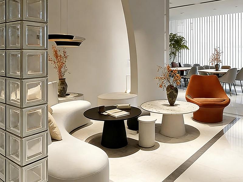 步入前厅,鱼肚白大理石前台与暖光灯带勾勒出精致质感,木格栅背景墙弱化了石材的冷硬,通透玻璃隔断既保证了采光,又巧妙划分出接待与过渡区域。一旁的休闲区以弧形白色沙发、黑白圆几与橙色单人椅形成视觉焦点,玻璃砖隔断在保证隐私的同时引入自然光,成为员工短暂休憩、客户洽谈的舒适角落,消解了传统办公的严肃感。