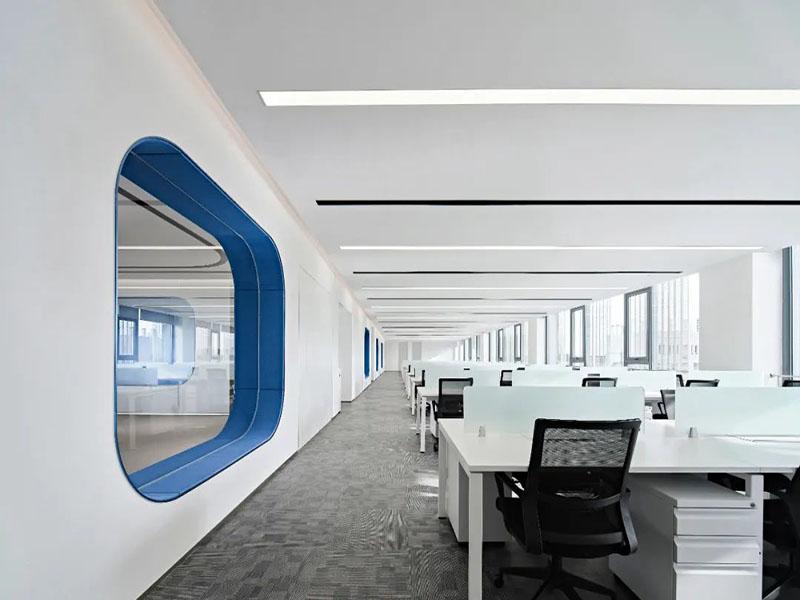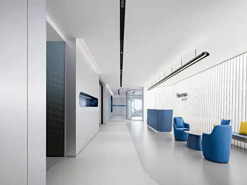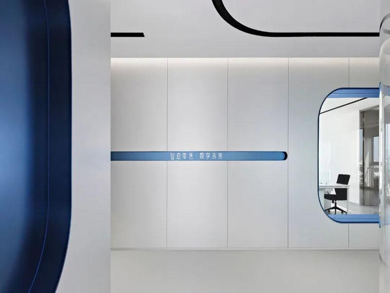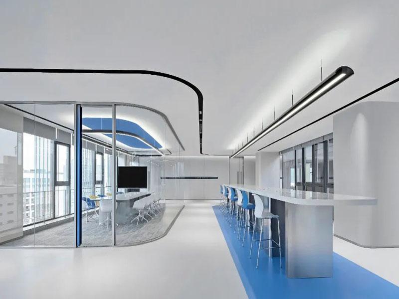 本次项目以“极简未来风”为核心定位,摒弃传统办公空间的沉闷刻板,选用纯净白搭配克莱因蓝作为主色调,精准贴合科技企业专业、严谨又富有创新的品牌特质。冷白基底奠定空间高级质感,亮眼的克莱因蓝作为点缀注入灵动活力,冷暖平衡之间既凸显科技行业的理性氛围,又避免空间过于冷硬。整体设计遵循极简美学,弱化冗余装饰堆砌,以流畅曲线、通透玻璃为核心材质,搭建轻盈开阔的空间骨架,没有繁杂造型干扰,全程贴合科技企业高效、简约的办公节奏。
