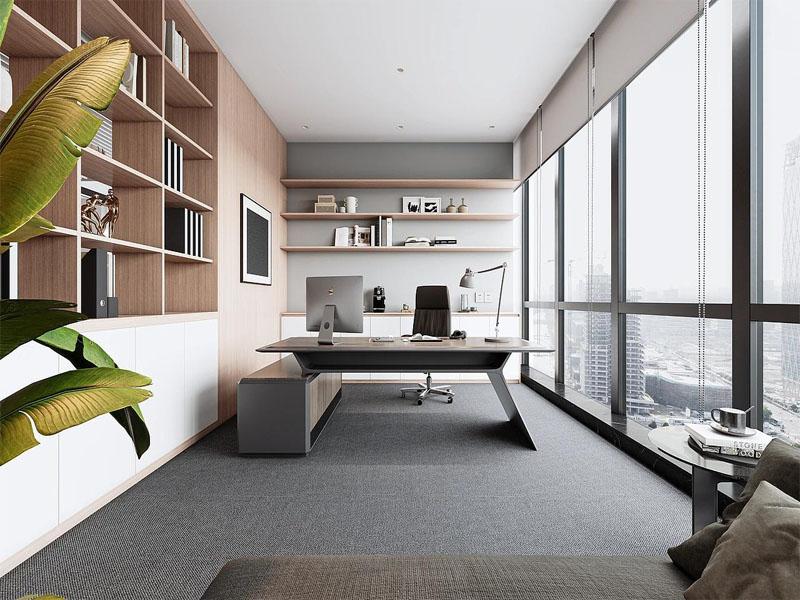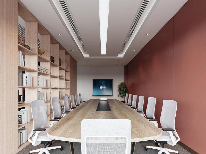 商务会议区与总裁办公区则进一步彰显了壹西格玛建筑的空间设计巧思。长条形实木会议桌搭配简约办公椅,红色背景墙成为视觉焦点,搭配嵌入式显示屏,打造出专业、高效的商务洽谈环境;总裁办公区临窗而设,原木色开放式书架与简约办公桌组合,既满足了办公收纳需求,又营造出静谧、雅致的专属办公氛围,让决策者在舒适环境中高效决策。