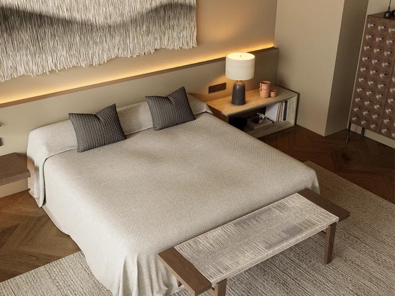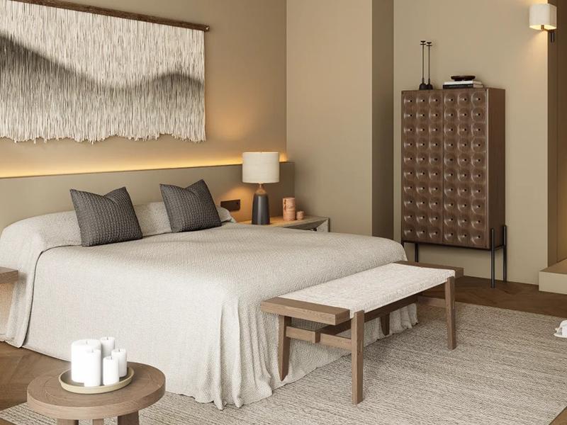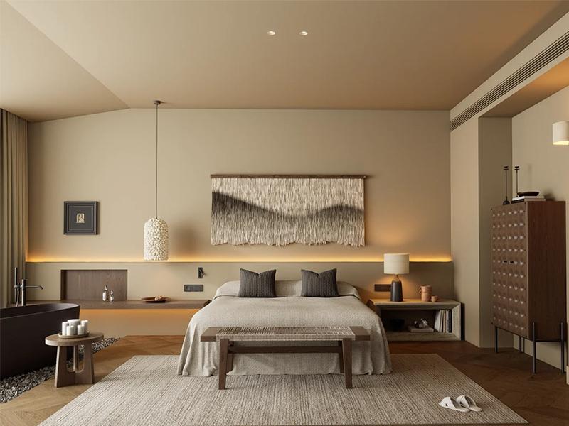 走进民宿的核心睡眠区,暖调的米杏色墙面如春日阳光般包裹着空间,与人字拼的实木地板形成温润的视觉对话。设计师摒弃了传统床头背景墙的厚重感,以一条暗藏的线性灯带勾勒出柔和的光带,为夜晚营造出朦胧而治愈的氛围。床品选用肌理感极强的亚麻面料,浅灰与米白的交织自带松弛感,搭配深灰色的针织靠枕,在材质的碰撞中传递出克制的高级感。