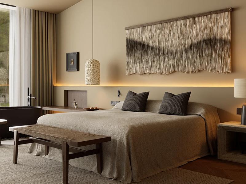 为了让 700 平米的空间更具通透感,设计师将卫浴区与睡眠区做了半开放式处理,以黑色独立浴缸为核心,搭配石质台面与鹅卵石地面,模糊了室内外的边界。窗边垂坠的亚麻窗帘过滤掉刺眼的光线,让自然光以最温柔的姿态涌入室内,与悬挂的石质吊灯相映成趣,营造出 “卧听山风,醒看云起” 的旅居意境。