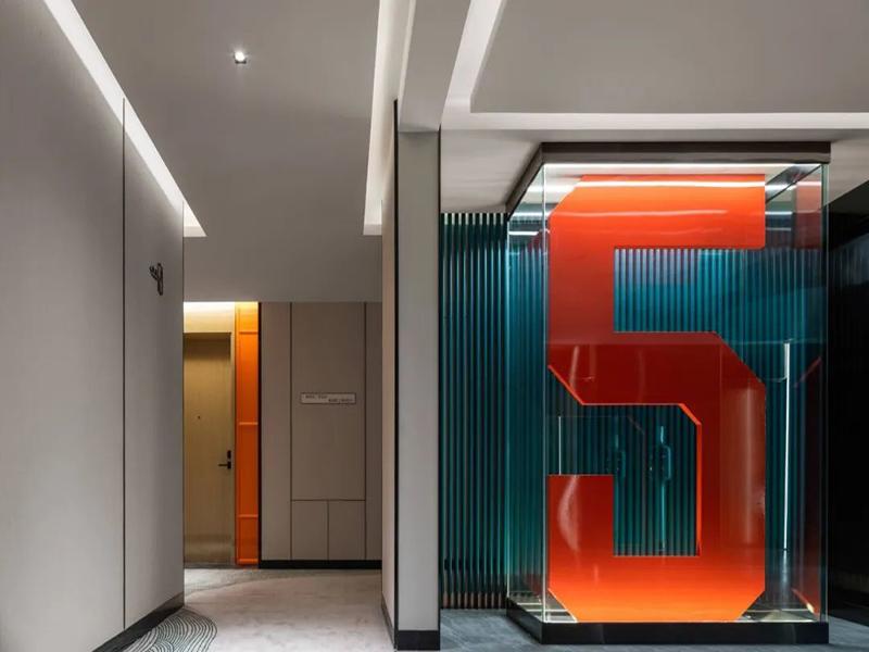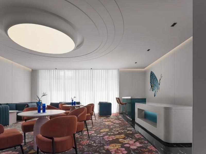 除此之外,我们也格外注重空间的实用性和动线合理性。电梯厅做了巨型发光数字导视,既能当装饰,客人找楼层也更方便;大堂休息区摆了蝴蝶艺术装置,铺了花卉地毯,让客人等待、休憩时更放松;餐饮区的悬浮橙色天花,一眼就能抓住注意力;客房则设计了开放式洗手台,和卧室相连,既延续了整体的精致感,也保证了私密空间的舒适度。