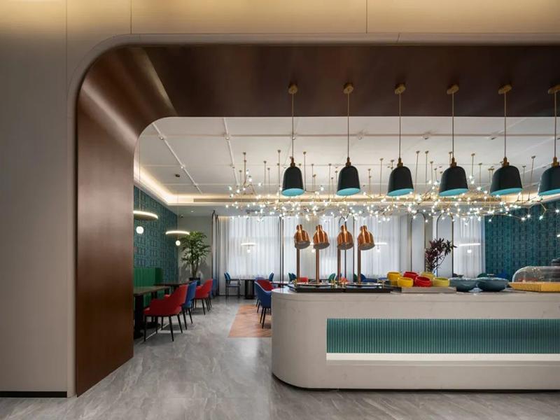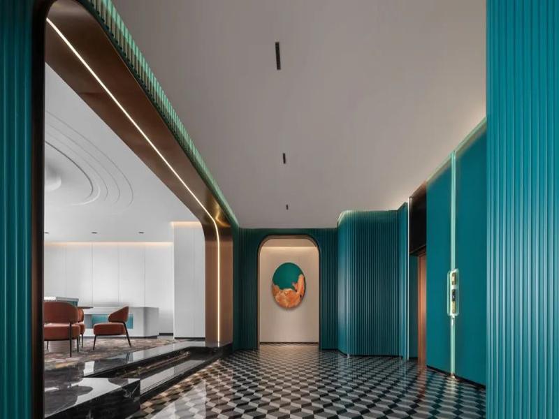在设计上,我们紧扣现代轻奢的调性,没有盲目堆砌元素,而是选定孔雀蓝做主色,搭配活力橙做撞色,再用米白、浅灰等中性色中和,既稳住了空间的沉稳雅致,又靠鲜明的色彩对比,让酒店有了很高的辨识度,不用费太多力气,就能在同类酒店里让人记住。