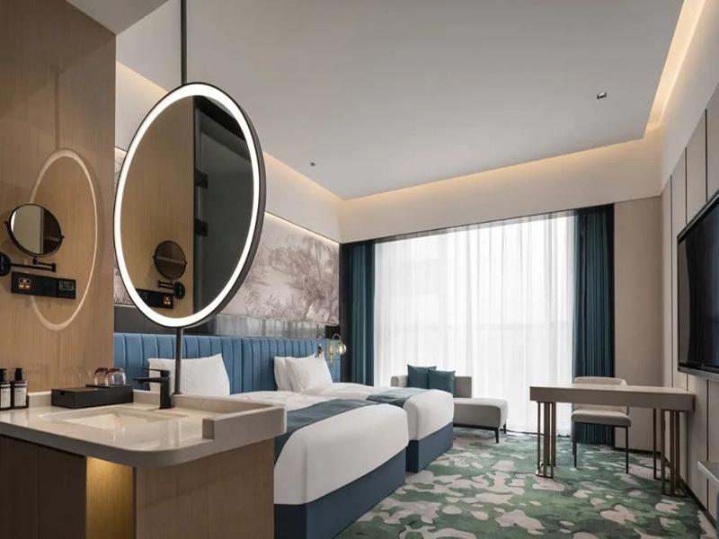 装修品质,终究要靠材质和工艺说话。公区墙面我们用了竖纹木格栅搭配金属板,不仅拉长了空间层高,还让整体质感更柔和,不显得生硬;地面选了黑白菱形大理石拼花,精致感一下就上来了;客房则铺了艺术花纹地毯,住起来更舒服。灯光方面,我们没有用单一的主灯,而是搭配了线性灯、圆形主灯和氛围灯带,既能勾勒出空间轮廓,又能营造出温暖的感觉,好看又实用。