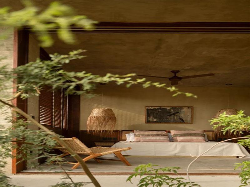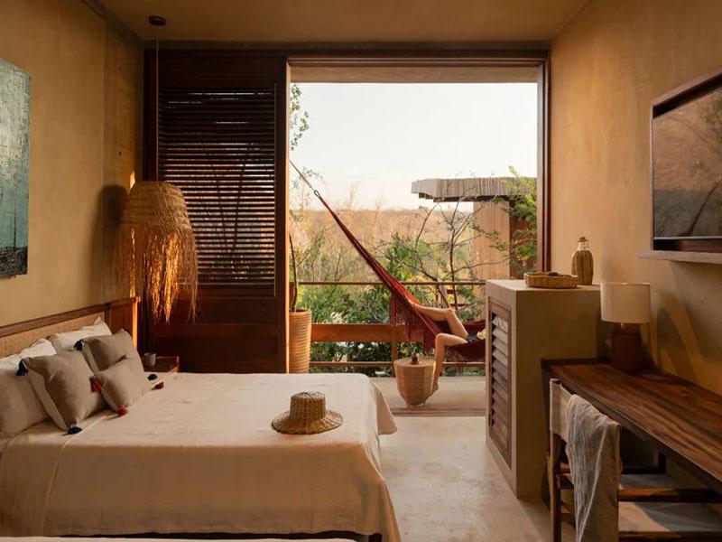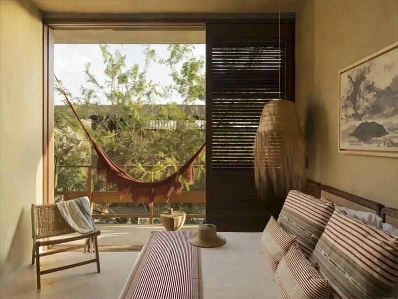客房是我们设计的核心表达:打通室内与露台的边界,让吊床、草木与远山成为生活的一部分。我们用藤编吊灯替代刺眼主灯,以棉麻床品与条纹抱枕传递松弛感,木百叶窗既过滤了强光,又保留了自然的通透——推窗是葱郁绿意,闭门是静谧私域,让成都人在半小时车程内,就能实现“从写字楼到山野”的场景切换。