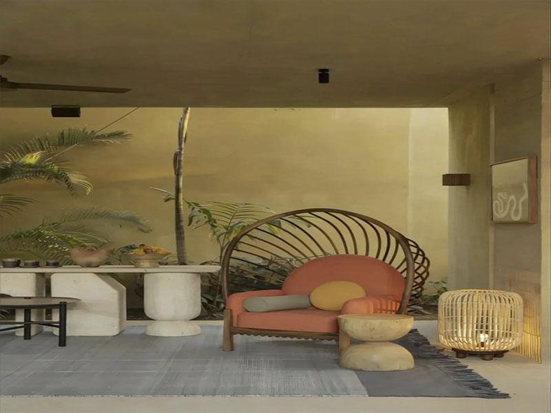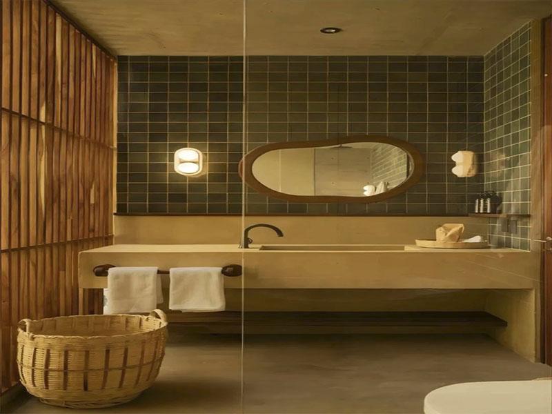 走进酒店,赤陶色的夯土墙与温润木作便消解了城市的喧嚣。我们摒弃了繁复的装饰,以微水泥地面+实木格栅+藤编软装为核心语言,让空间回归本真。浴室里,深绿小方砖与悬浮陶土台盆碰撞出质朴质感,不规则木框镜与双球壁灯的暖光,让洗漱也成为一场治愈仪式;公共区域的藤编吊椅、石质边几与原生绿植共生,阳光透过百叶窗筛下斑驳光影,恰好呼应成都人“慢耍快活”的生活态度。