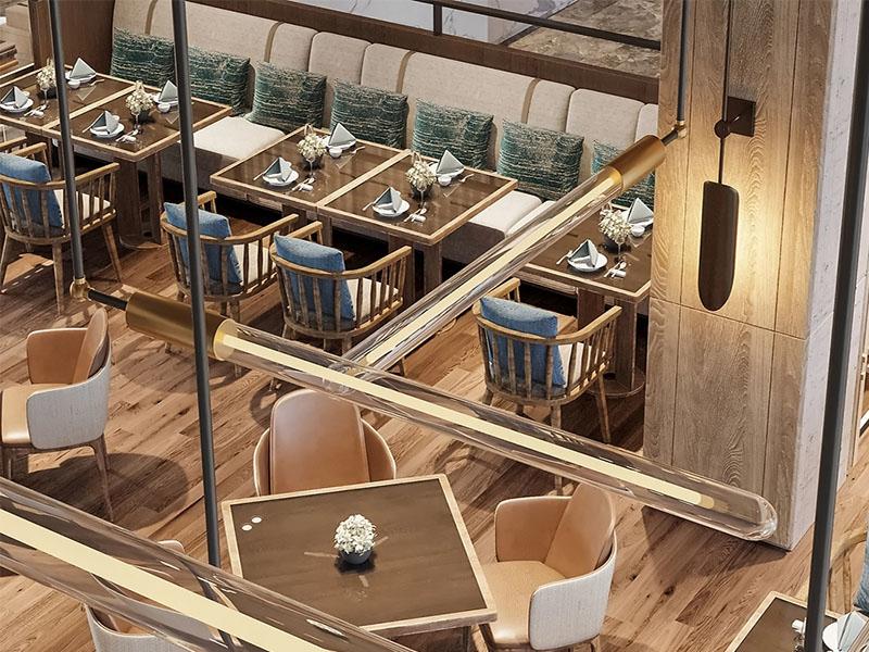 公共餐饮区域则延续了项目的设计语言,木质餐桌椅与布艺卡座的组合,既保留了酒店的温馨感,又适配了多人用餐场景。长条形透明灯管与木质墙面的碰撞,让光线在空间中自由流动,搭配精致的餐具与花艺装饰,让用餐成为一场兼具视觉与味觉的享受。