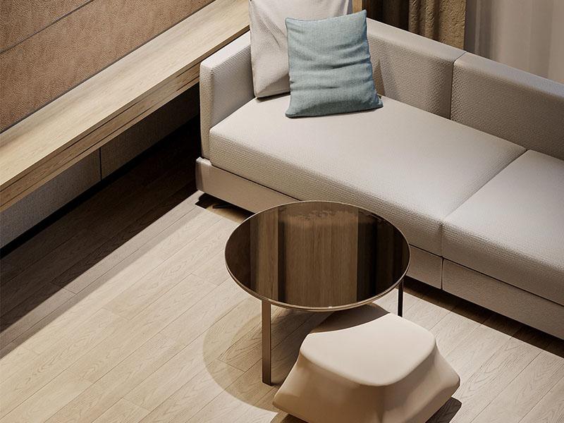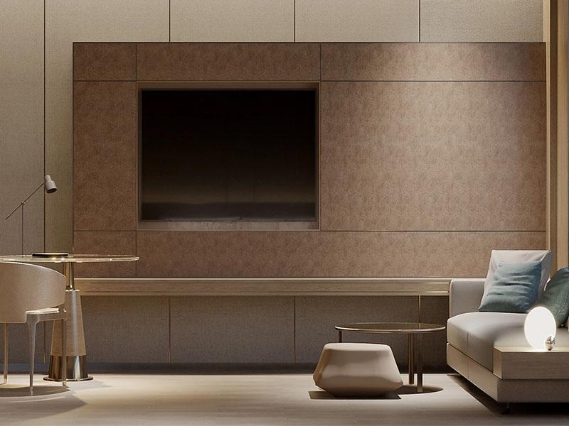 步入客房区域,温润的木色与浅灰墙面奠定了空间的基调,金属线条的勾勒则为整体增添了轻奢质感。电视背景墙采用大面积的皮质硬包,纹理细腻且触感柔和,与下方的原木长柜形成材质对比,既满足了收纳需求,又让视觉层次更加丰富。一旁的休闲沙发区,浅米色布艺沙发搭配雾蓝色抱枕,与金属边框的圆形边几、几何造型矮凳相互映衬,在柔和灯光的笼罩下,成为旅客放松身心的绝佳角落。