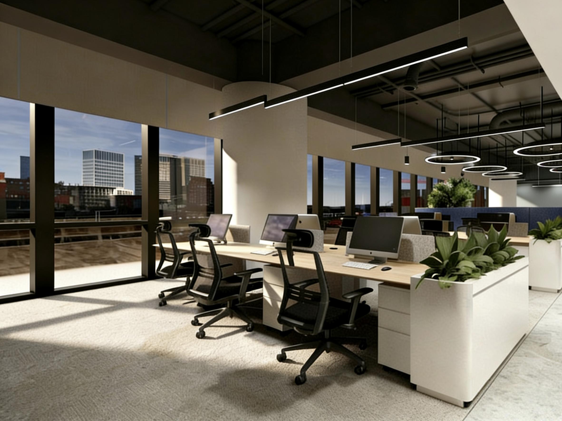 工位隔断选用绿植花箱+磨砂玻璃组合,既划分功能区域,又净化空气、软化空间硬质感,实现生态与实用的结合,契合成都绿色办公的发展趋势。