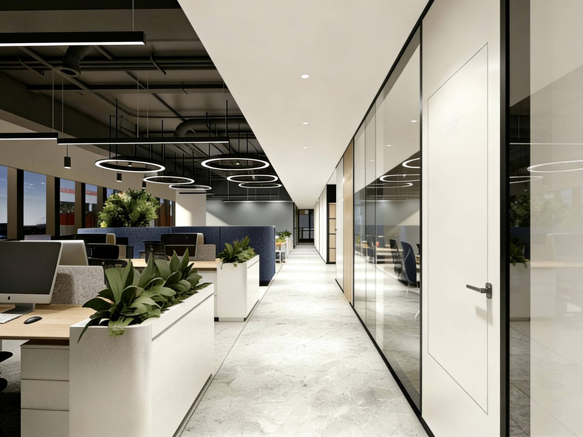 地面通铺浅灰色哑光水泥质感地砖,耐磨易清洁,适配高频办公场景,同时传递工业风的质朴肌理;墙面采用白色哑光墙板+局部木饰面拼接,搭配黑色金属收边条,线条利落干净,触感高级且强化空间层次感;顶面采用无主灯设计,裸露风管保留工业质感,搭配嵌入式线性灯、筒灯与环形氛围灯,实现“见光不见灯”的光影效果,满足不同场景的照明需求。