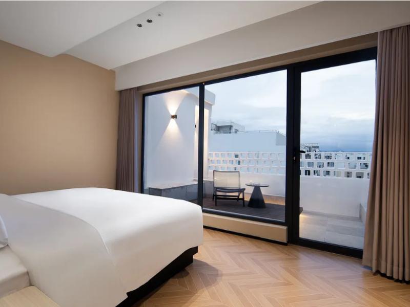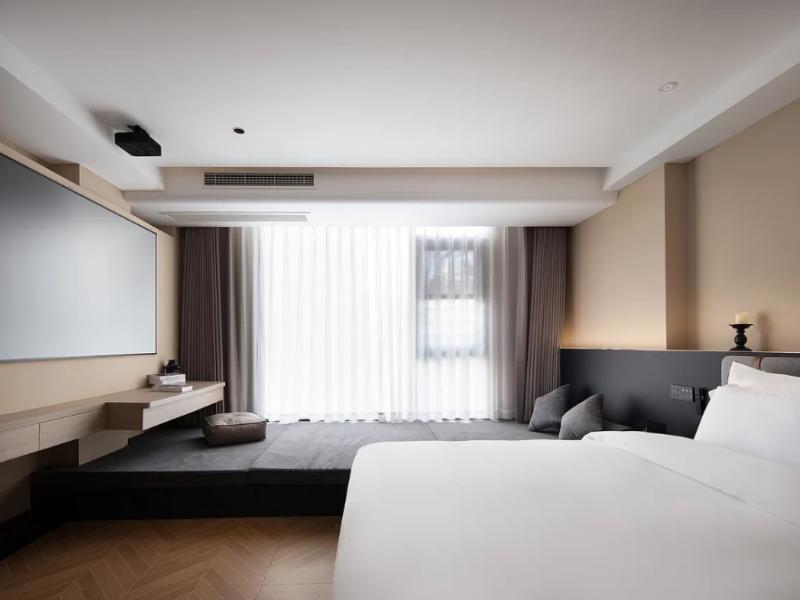 客房区是设计的核心亮点,共规划多间主题客房,每间房都做到了 “空间不拥挤,体验不打折”。墙面延续奶咖色主调,搭配人字拼实木地板,与青城山的自然肌理相呼应;床头背景以炭黑线条勾勒,搭配嵌入式灯带,营造出温馨的睡眠氛围。部分房型配备超大落地窗与露台,推窗即见青城山峦,露台处摆放简约休闲桌椅,成为客人观山、看星、品茶的专属空间。
