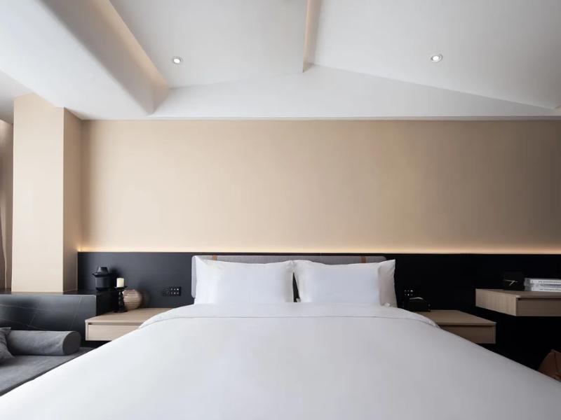 公区前台是民宿的 “第一印象”,我们采用微水泥与天然石材结合的设计,利落的线条搭配柔和的灯光,弱化了商业感,更像山间的静谧会客厅。墙面的立体肌理与简约灯具形成层次,让每一位客人踏入民宿的瞬间,就能卸下旅途的疲惫。