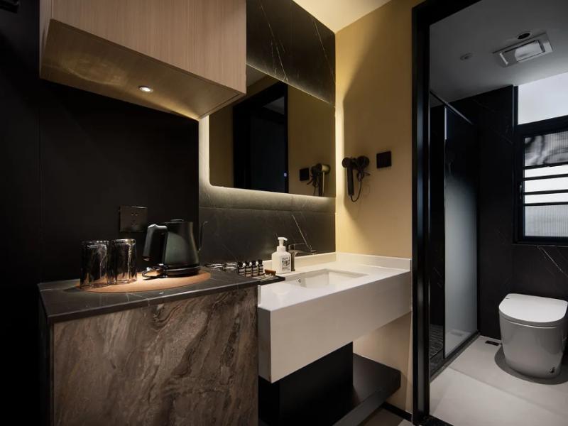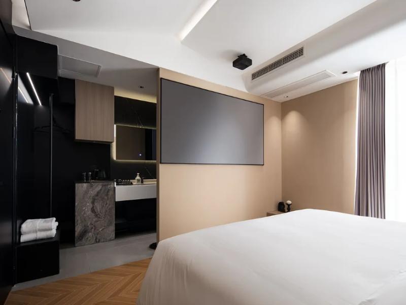 卫浴区采用干湿分离设计,天然大理石与黑色金属材质碰撞,搭配智能马桶、壁挂式吹风机等高端配置,细节处彰显品质。同时,每间客房均配备巨幕投影,让客人窝在柔软床品中,既能赏山景,也能享影音体验,满足度假的多元需求。