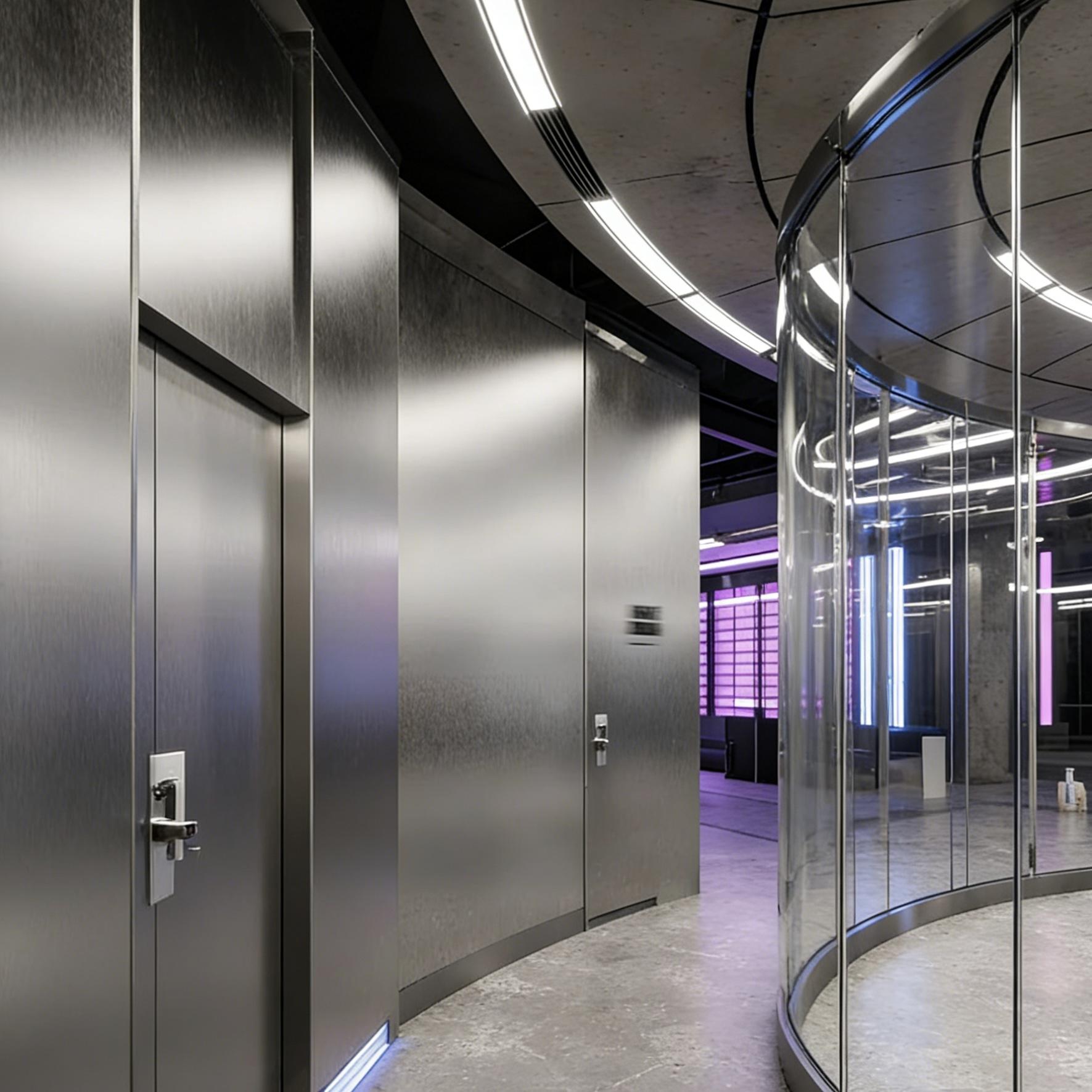 整面金属质感墙面低调沉稳,与壹西格码 “专业、严谨、创新” 的品牌精神形成天然呼应 —— 在理性的框架中,保持对品质与效率的极致追求。左侧暖橙色灯带打破金属冷调,为硬朗空间注入一抹柔和暖意,搭配两把蓝色休闲椅,形成临时洽谈与放松的过渡区,让严肃的办公场景多了几分松弛感,也体现出企业对员工人文关怀的重视。