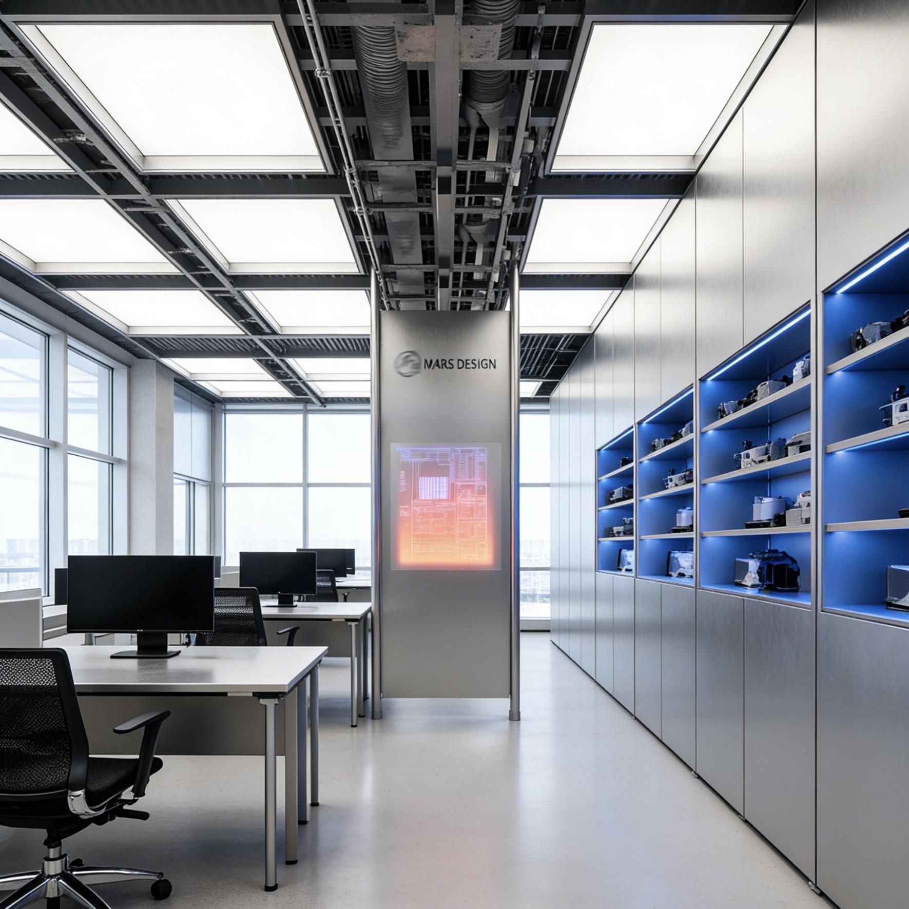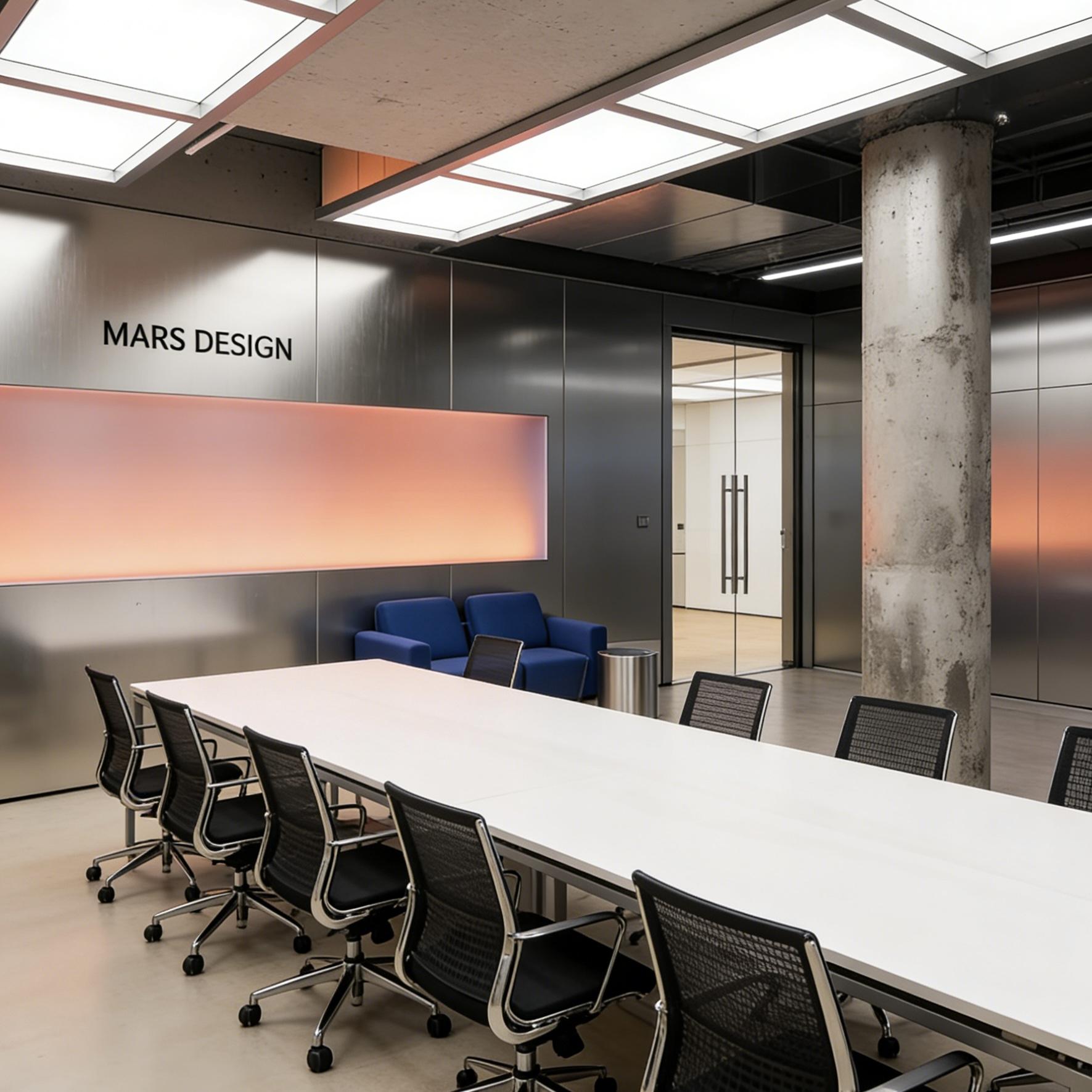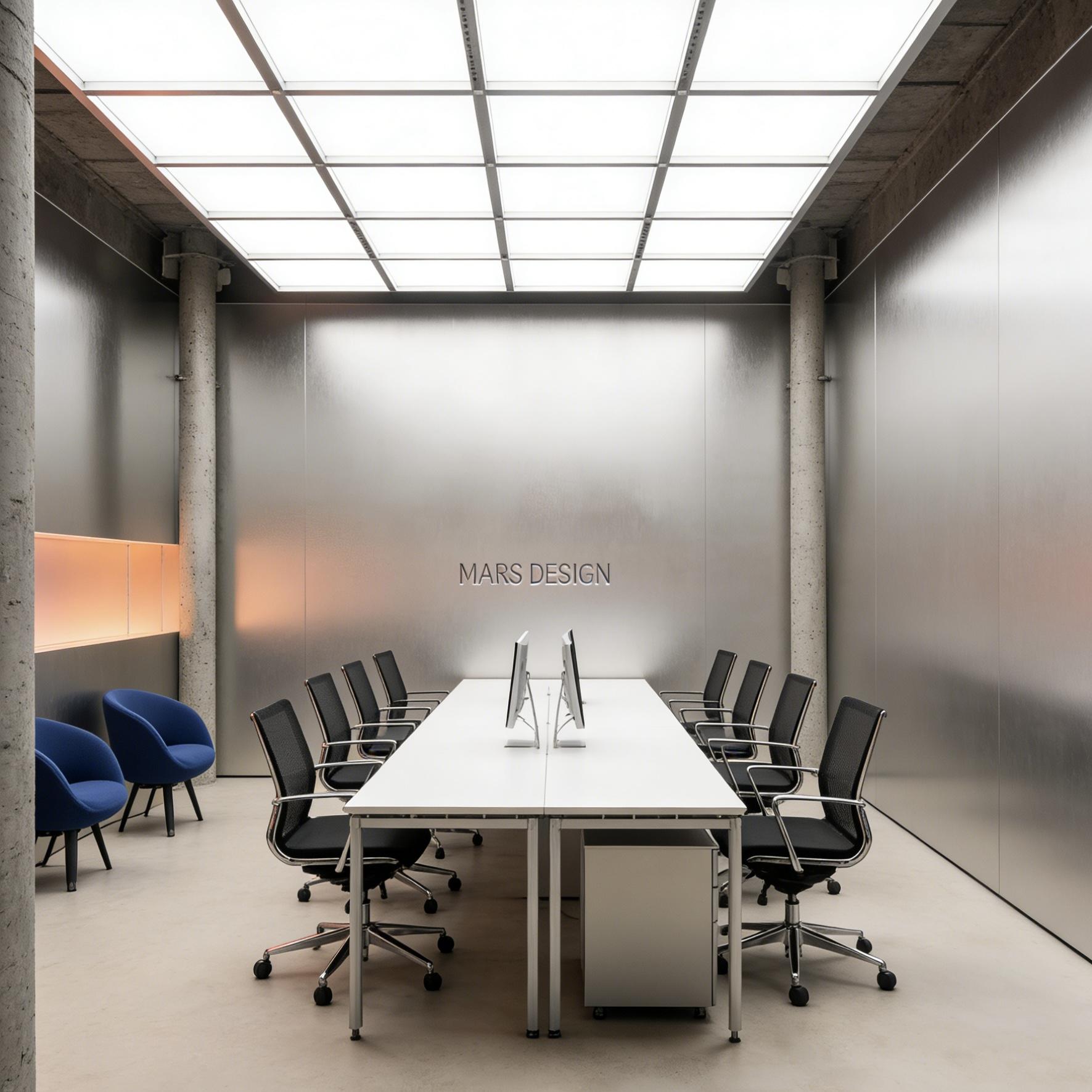 步入壹西格码的核心会议空间,扑面而来的是利落通透的视觉感受。裸露的混凝土立柱与金属质感墙面形成材质对话,保留建筑原始肌理的同时,赋予空间硬朗的工业风骨。大面积柔光吊顶灯组均匀铺陈,摒弃炫光干扰,为室内提供柔和稳定的照明,让每一次头脑风暴都能在清晰舒适的光线下展开。中央长桌采用模块化设计,简洁的白色台面与金属支撑结构相得益彰,既满足多人协作需求,又维持着空间的轻盈感,搭配黑色网布办公椅,兼顾人体工学支撑与视觉简约性,细节处彰显对办公效率的考量。