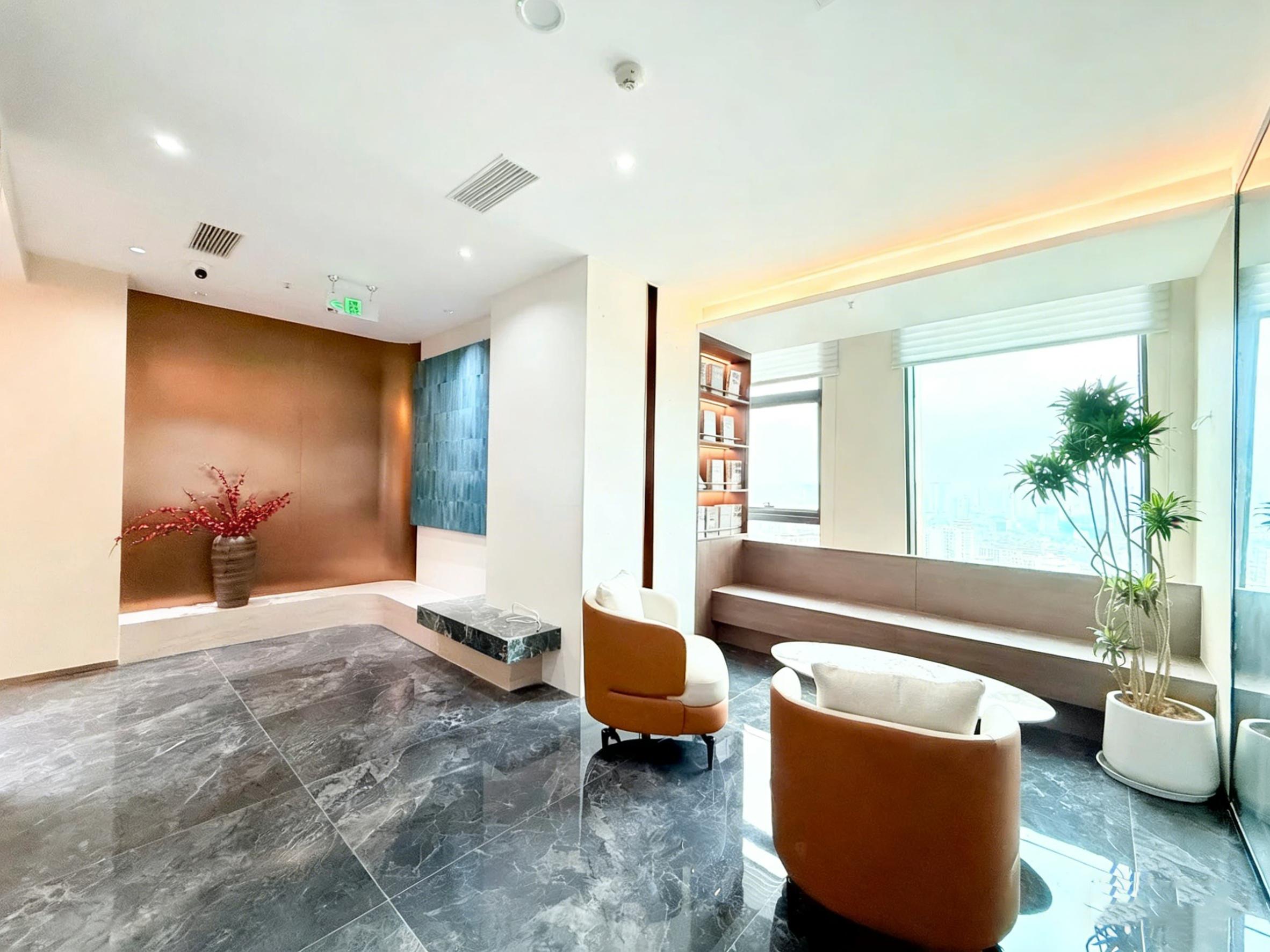 休闲接待区是空间的温度担当:灰色大理石地面与暖橙色单人椅形成视觉对比,艺术装置与大型绿植软化了商务感,大面积落地窗将城市景观引入室内,让员工在忙碌之余能短暂休憩,也为访客提供了轻松的交流场景。