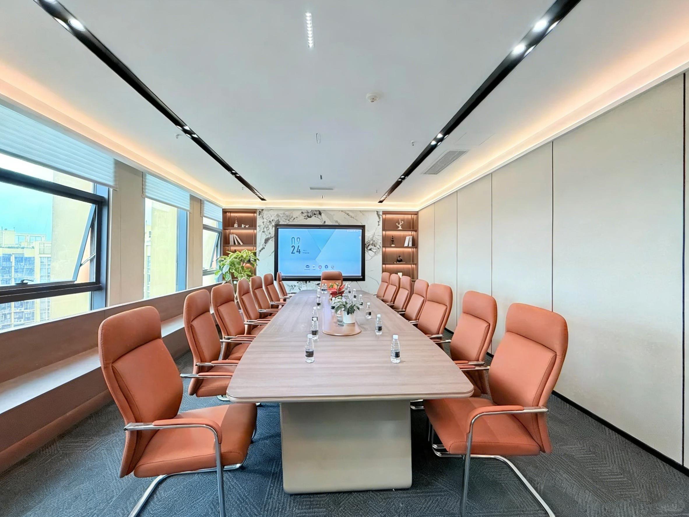 会议室作为企业对外沟通的核心场景,设计上兼顾专业感与仪式感:木质长桌搭配暖橙色皮质座椅,背景墙以大理石纹理与嵌入式书架营造稳重氛围,高清会议屏与线性灯光系统则保障了远程会议与内部研讨的清晰体验,让每一次沟通都高效有序。独立高管办公室则以沉稳的木色与通透的玻璃柜体为主,搭配宽大办公桌与舒适休闲沙发,在满足办公需求的同时,预留了接待与思考的静谧空间,彰显企业管理者的专业气度。