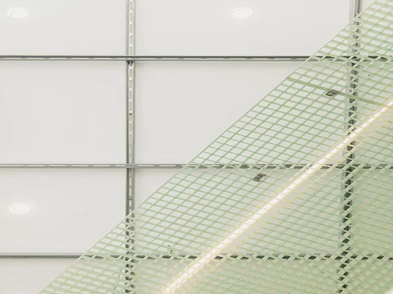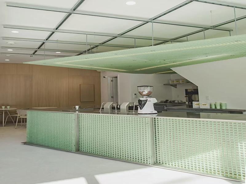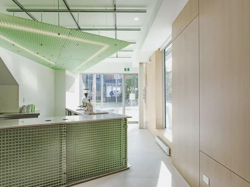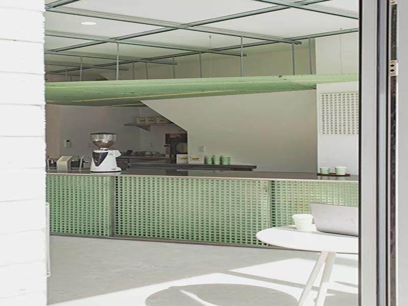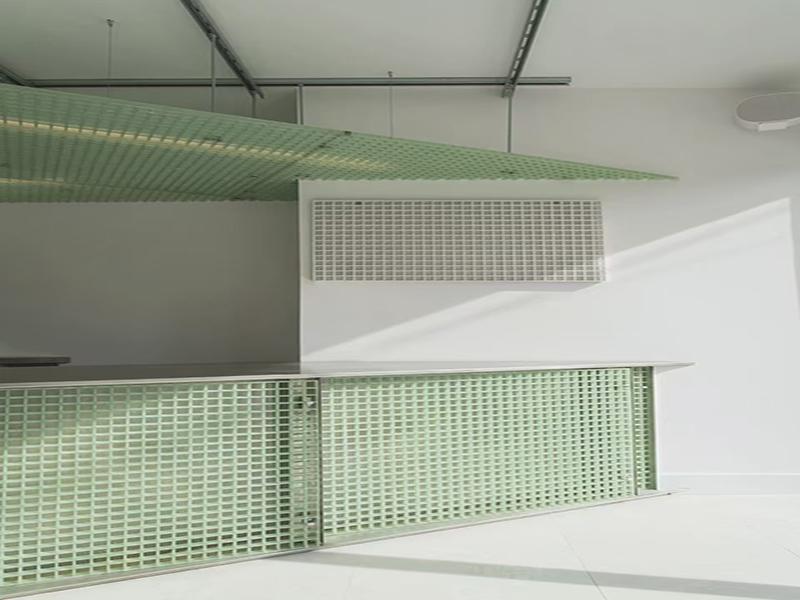 材料选择上,壹西格玛团队优先选用玻璃钢格栅(FRP)作为核心装饰材料,这款材料兼具耐腐、轻质、易安装的优势,且能实现半透明光影效果,广泛应用于吧台立面、悬挂式顶棚及外墙装饰块。我们选用清新薄荷绿色调,与白色墙面、浅灰色水泥地面、浅木色辅助材质形成鲜明对比,既弱化了工业材料的冷峻感,又让整个空间更显轻盈通透,同时格栅的镂空结构可让自然光穿透,投射出带有品牌标识的光影,实现品牌传播与美学设计的完美融合,彰显壹西格玛“空间价值最大化”的设计追求。