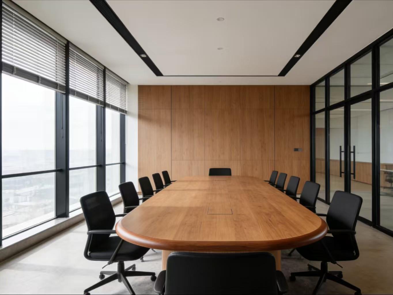 会议室与独立办公区则兼顾私密性与实用性,黑框玻璃隔断搭配可调百叶,满足商务洽谈、内部会议的不同需求。会议桌选用本地优质实木定制,边缘做圆润处理,细节处尽显人文关怀;董事长办公室以木饰面与大理石搭配,定制藏书柜暗藏线性灯光,融入川派中式元素,沉稳大气中透着成都独有的精致内敛,既符合商务办公的严肃性,又传递出地域文化底蕴。