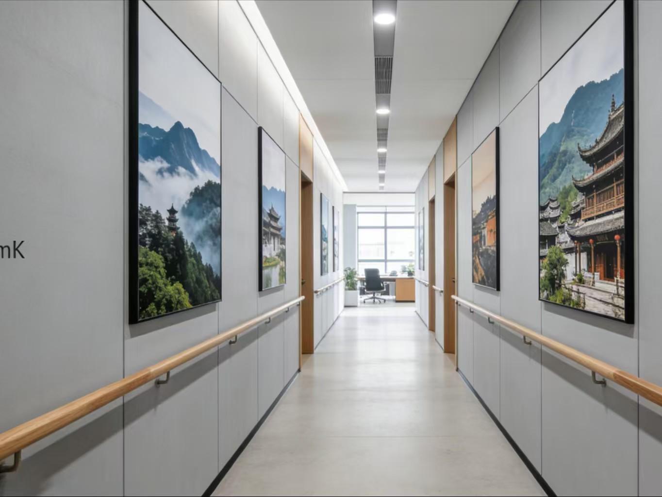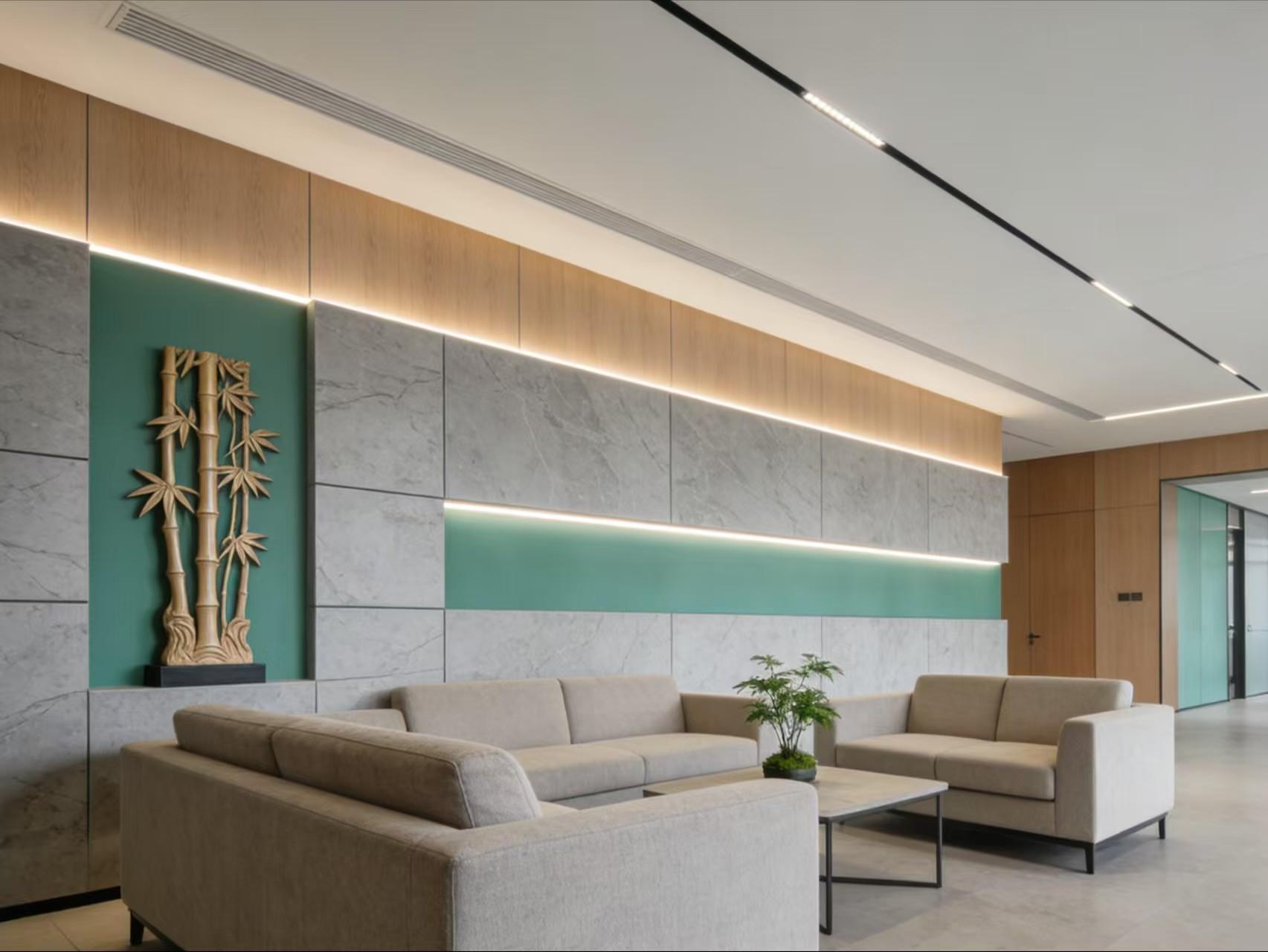 前厅作为企业第一印象,设计师摒弃繁复造型,采用简约石材拼接形象墙,搭配线性灯光与艺术竹雕摆件,将川蜀竹文化隐性植入,低调彰显地域特色;等候区选用柔软布艺沙发,搭配小型绿植,复刻成都茶馆的闲适氛围,让客户到访便能感受蓉城独有的从容与热情。