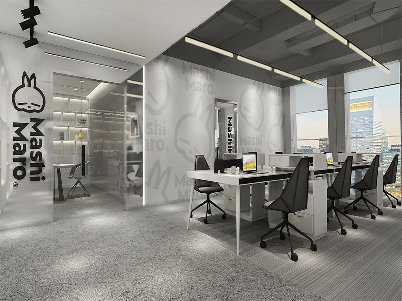 空间整体采用开放式布局,左侧定制化展示墙与线性灯带结合,既满足企业形象展示与资料陈列需求,又通过光影层次提升空间通透感;中央开放工位区以简洁利落的白色办公桌搭配黑色几何造型座椅,既保证办公效率,又强化现代简约的视觉调性。大面积落地窗将城市景观引入室内,配合浅灰色地毯与线性照明系统,营造出明亮舒适的工作环境,完美体现成都办公室设计对人性化与美学的双重追求。