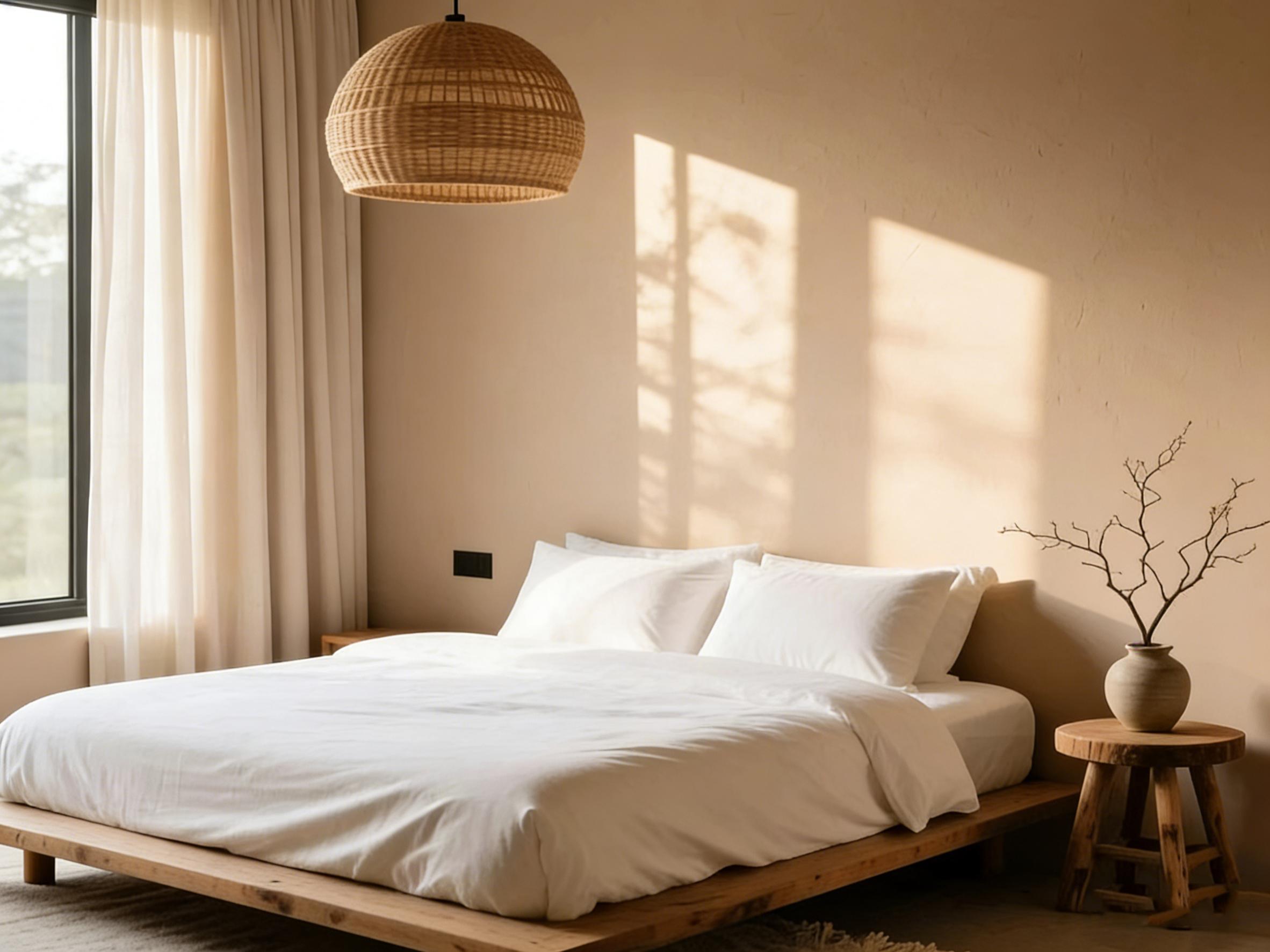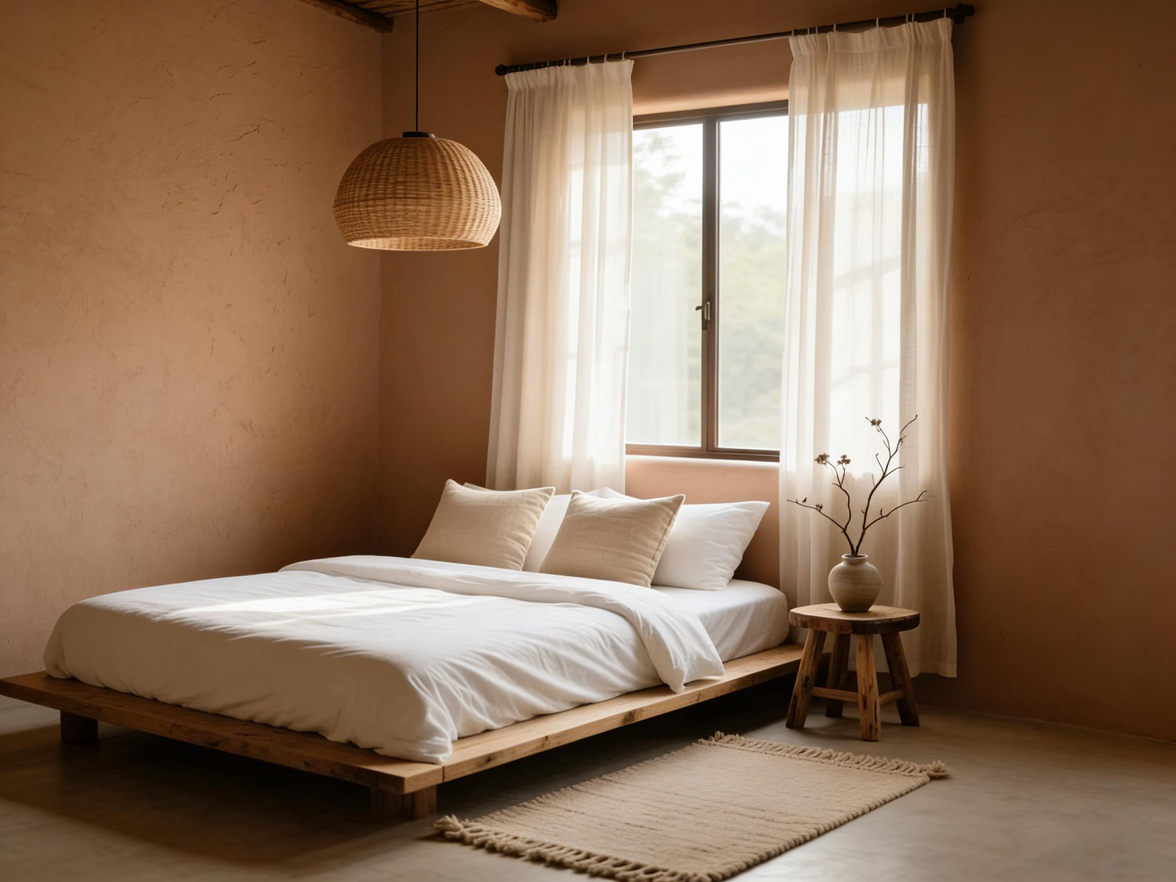 设计团队以 “光” 为线索,大面积的落地窗与半透白纱帘,将自然光线温柔引入室内。清晨的柔光透过窗纱漫过木质家具,午后的树影在墙面摇曳,傍晚的暖光则包裹着休憩角落,让光影成为空间最灵动的装饰。无论是客厅的低矮沙发、卧室的无床头床架,还是公共区域的原木吧台,都选用未经精细打磨的实木、亚麻织物与粗陶器皿,保留材质的原生纹理,传递出手工温度与岁月质感。