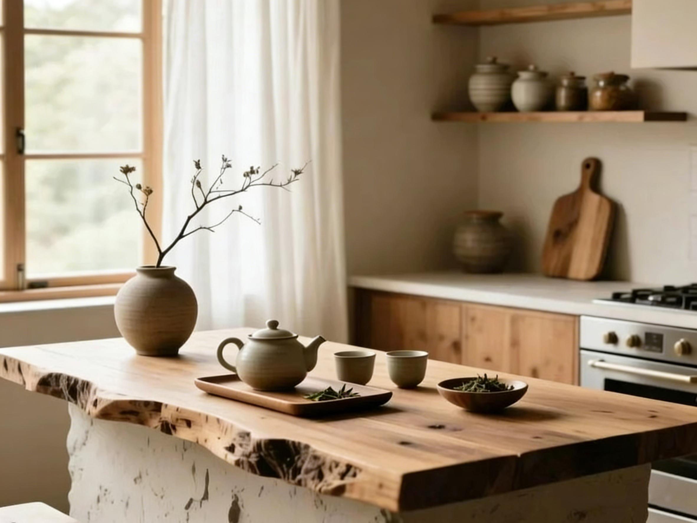 功能布局上,设计师将 900㎡的空间划分为公共休闲区、客房区与餐厨区,既保证了民宿的运营效率,又为住客营造了私密且松弛的体验。公共区域以开放式布局串联起茶歇区与阅读角,粗陶花瓶里的干枝、层板上的陶罐与盆栽,让自然意象渗透到空间的每个细节;客房区则以极简的线条弱化边界,木质床架与亚麻床品呼应着窗外的乡野景致,藤编吊灯与矮边几的组合,让睡眠空间更具包裹感与安全感;餐厨区保留了实木橱柜与开放式置物架,质朴的餐具与天然石材台面,让烹饪与用餐也成为一种贴近自然的仪式。