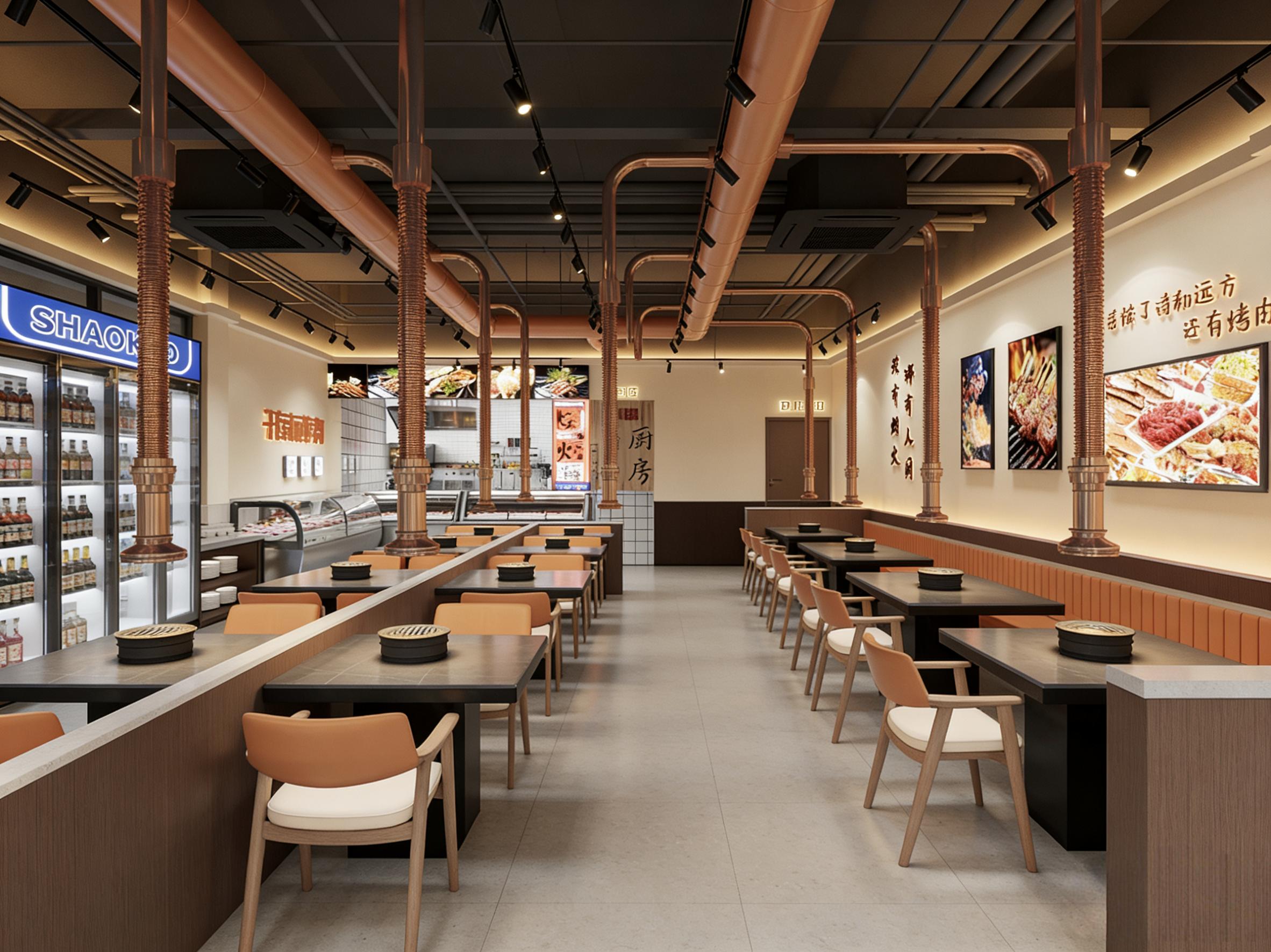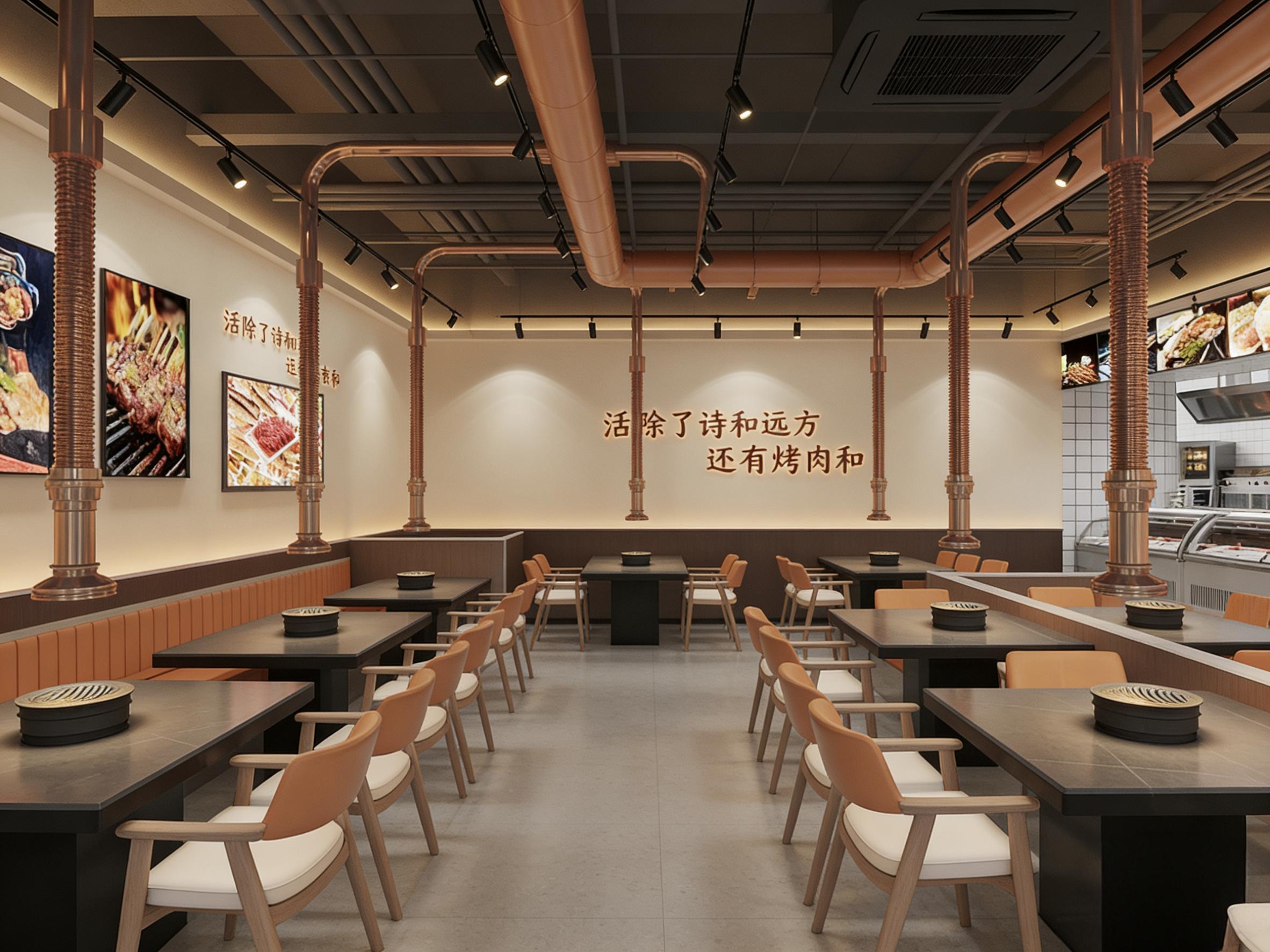 步入店内,扑面而来的是工业风特有的利落与粗犷。裸露的天花板上,铜色排烟管道与黑色金属管线纵横交错,既是烤肉店高效排烟的功能保障,也化作空间最具辨识度的视觉符号。管道表面的金属纹理与复古做旧质感,复刻了老成都工业遗存的记忆,而暖光轨道灯的点缀,则为冷硬的线条注入了温润的烟火温度,让整个空间在硬朗中透着亲切。墙面以米白与深棕木色拼接,下半部分的软包卡座既提升了用餐舒适度,又用柔和的弧度中和了工业元素的尖锐感,完美适配成都人“巴适安逸”的生活追求。