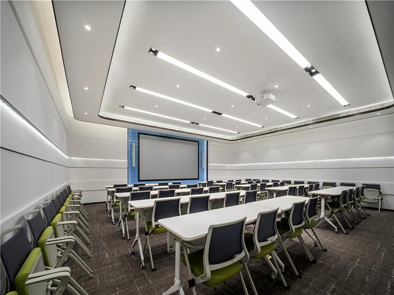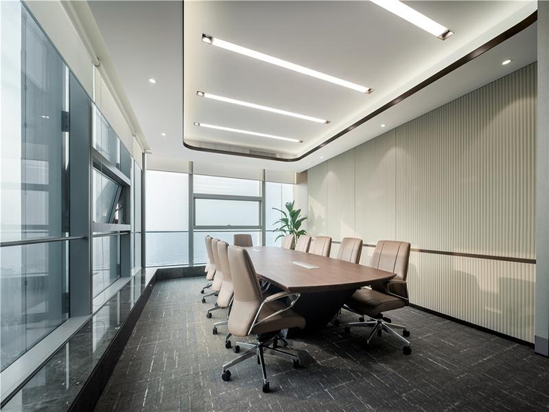 针对不同场景的需求,我们做了精细化功能设计:总裁办公室以大面落地窗引入城市景观,深胡桃木大班台搭配浅米色皮质沙发,线性灯带与筒灯的分层照明,既彰显了决策者的沉稳格局,又能让办公环境更显舒适;会议室以竖向木格栅为背景墙,搭配玻璃隔断与线性灯带,专业感十足,深棕色实木会议桌与米色皮质办公椅的组合,兼顾了质感与舒适度,适配高层决策与商务洽谈;培训室则采用蓝白撞色墙面与可移动课桌椅,灵活满足培训、会议等多元需求,顶部线性灯与嵌入式筒灯保证了均匀照度,让知识传递更高效。