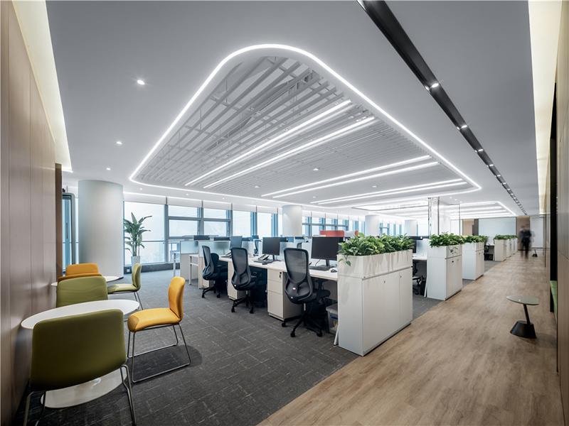 核心办公区采用开放式布局,弧形线性灯与裸顶格栅吊顶弱化了层高压迫感,让空间更显通透开阔。白色工位柜与绿色植物隔断巧妙划分区域,既保证了采光与通风,又能有效降低办公干扰;局部点缀的黄绿休闲椅,为严肃的办公氛围注入了活力,让员工在忙碌间隙能短暂放松,提升工作幸福感。