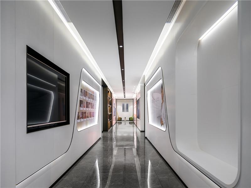 我们近期完成的这套甲级写字楼办公项目,从功能分区到细节打磨,都在践行 “高效办公与品质体验并行” 的设计理念。走进空间,首先映入眼帘的是形象走廊 —— 大面白色弧形硬包搭配暗藏灯带,大理石地面反射着柔和光线,嵌入式展示框与电视墙自然融合,既简洁大气,又能直观传递企业品牌文化,让每一位访客都能第一时间感受到企业的专业与温度。
