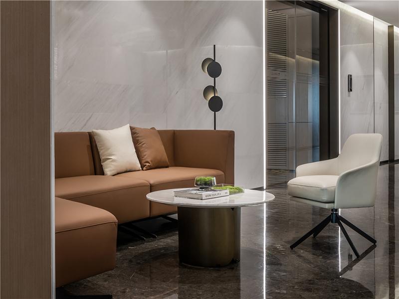 休闲接待区是空间的 “缓冲带”,暖棕色皮质沙发与大理石圆几营造出轻松的会客氛围,艺术感落地灯与大理石墙面呼应,在保持整体风格统一的同时,提升了空间的精致度,让商务沟通也能在舒适的环境中自然展开。