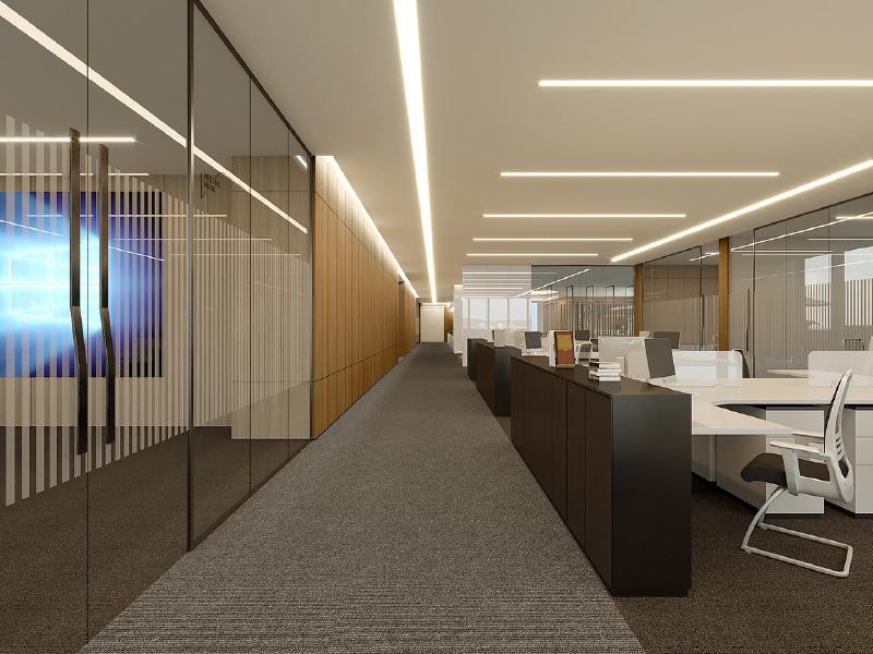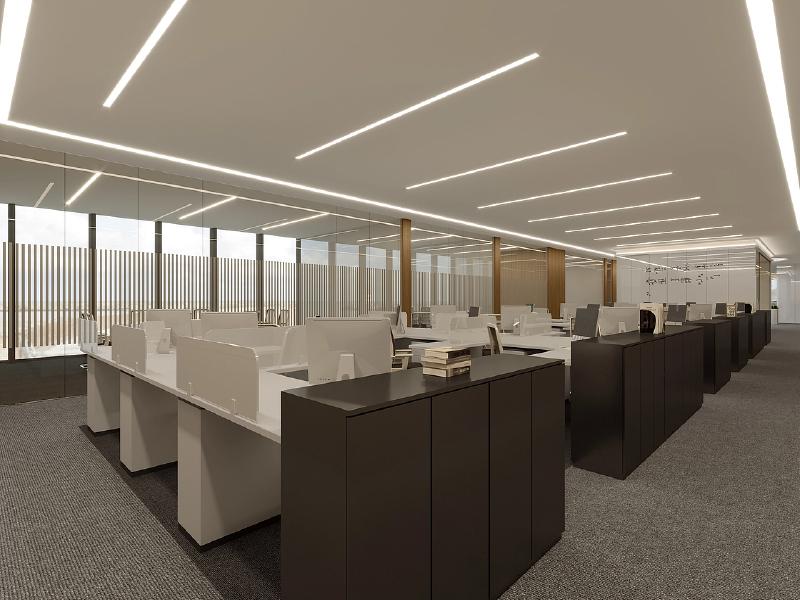 开放办公区采用模块化工位布局,白色桌面与黑色储物柜形成清晰的功能分区,线性 LED 灯带沿天花板有序排布,营造出明亮且富有秩序感的工作环境,充足的储物空间满足了金融行业大量文件、资料的收纳需求,同时符合人体工学的工位设计,保障了员工长时间办公的舒适度,提升日常办公效率。