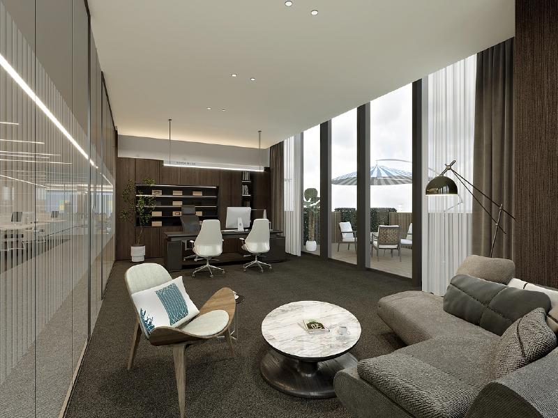 休闲与接待区则融入了绿植造景、弧形吊顶与开放式书架,暖调皮质座椅与大理石茶几的搭配,弱化了办公的严肃感,为员工休憩、客户洽谈营造出舒适放松的氛围,让金融服务在轻松的环境中高效推进,彰显企业的人文关怀。经理室采用独立玻璃隔间设计,兼顾了办公的私密性与空间的通透感,大面积落地窗引入户外景观,搭配休闲沙发与高端办公桌椅,实现了工作与接待的双重功能,既满足了管理层独立办公的需求,又能在此完成重要客户接待,彰显企业的高端形象。