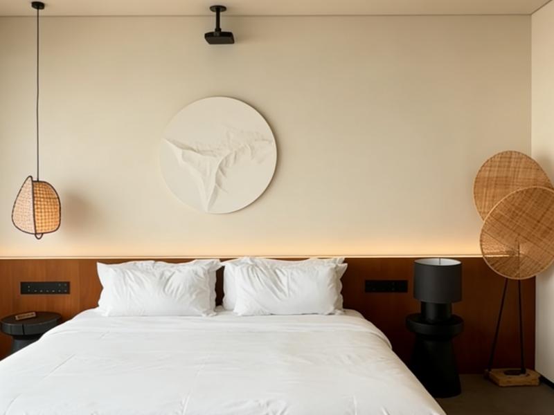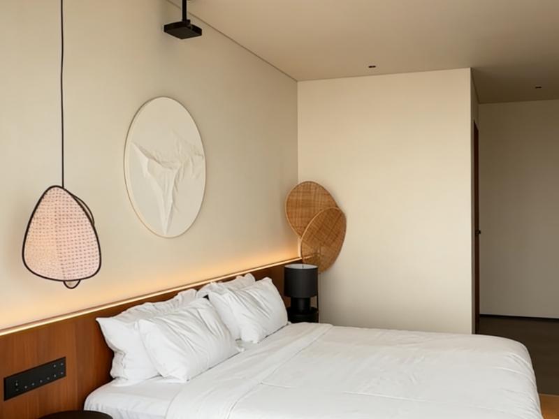 床头我们没有选择传统装饰画,而是定制了立体肌理浮雕,简约的线条勾勒出海浪轮廓,与窗外实景呼应,让「海」从视觉延伸到触觉。藤编吊灯与木质床头柜延续自然质感,细节处藏着设计的用心 —— 每一处灯光的色温、每一件家具的摆放角度,都为了让住客能沉浸式感受海的温柔。