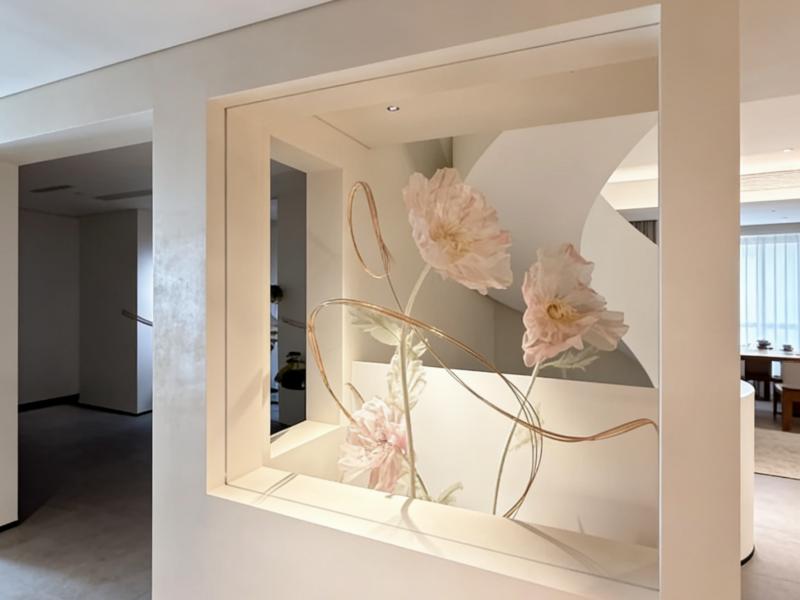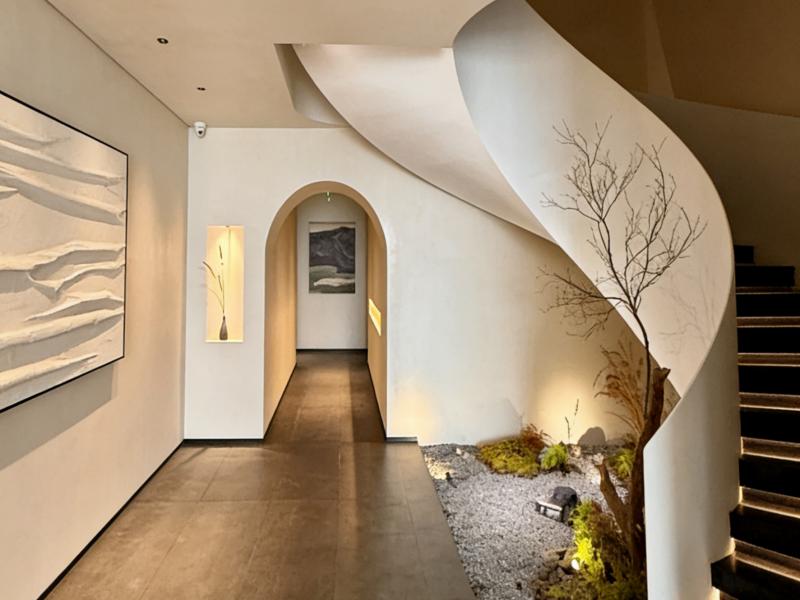 旋转楼梯是公共区的「灵魂设计」,流畅的弧形线条打破空间硬朗感,楼梯下方打造枯山水造景,碎石、枯枝、苔藓点缀其间,搭配柔和灯带,既增添了禅意氛围,又成为住客打卡的隐藏角落。走廊的花艺装置则是点睛之笔,柔化了空间的冷硬感,成为连接各个区域的「视觉纽带」。