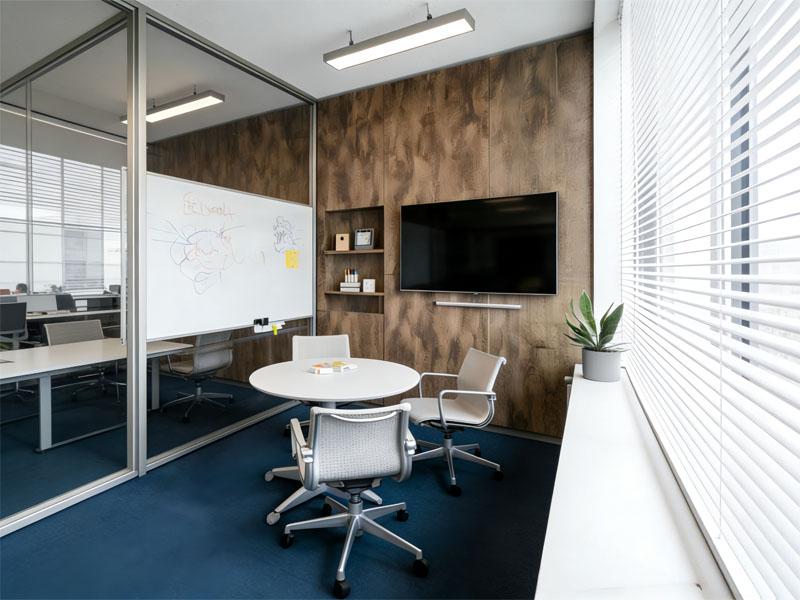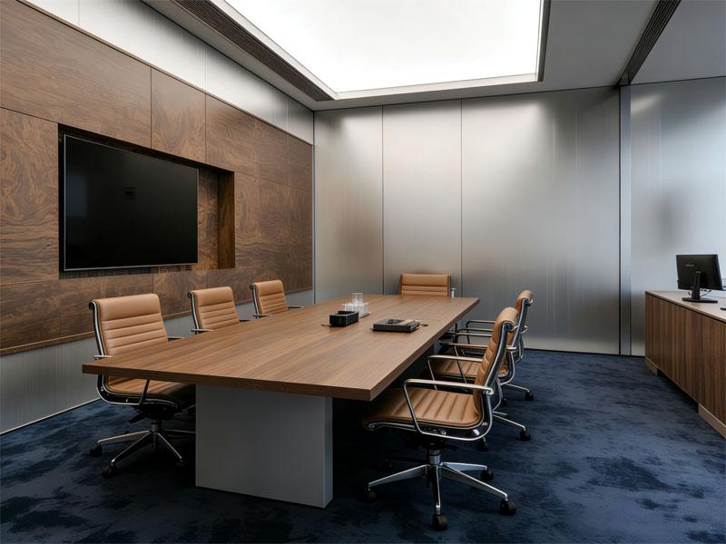会议室作为商务决策的核心场域,设计师选用深胡桃木与哑光金属墙板,搭配藏式顶灯与定制会议桌,在视觉上形成稳重的围合感,既满足多人会议的功能需求,又彰显企业的专业气度。而小型洽谈区则更偏向灵活与轻松,木质背景墙与白色圆桌的组合,搭配可书写白板与绿植点缀,成为头脑风暴与轻量沟通的理想场所。