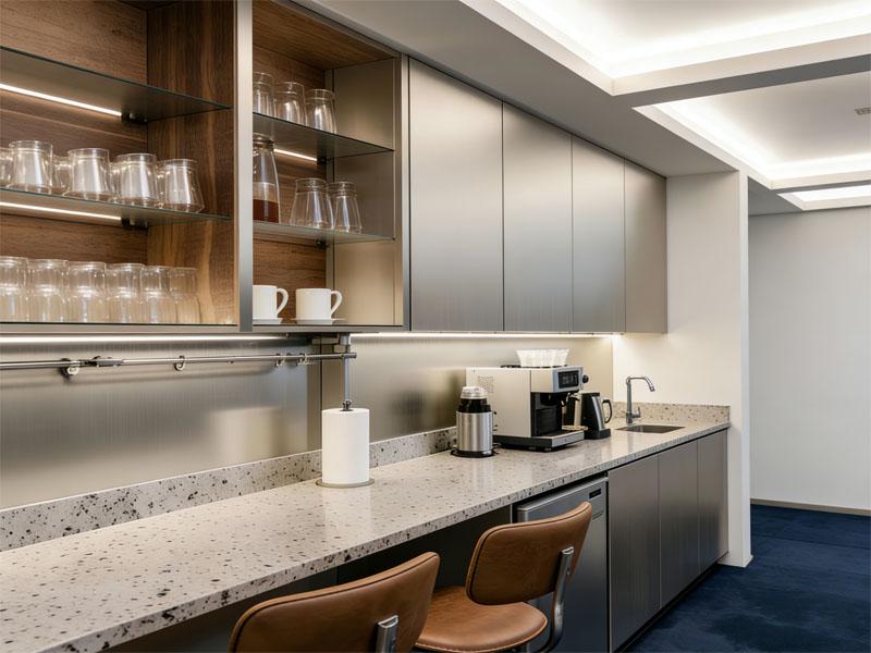 茶水间作为办公空间的「能量补给站」,设计师用石英石台面与金属吊柜打造整洁实用的操作区,开放式玻璃搁架与暖光灯带,让日常休憩也充满仪式感,有效缓解工作疲劳。整个项目中,四川壹西格玛建筑工程有限公司始终坚持「功能优先、质感共生」的设计原则,在成都快节奏的商务环境中,为企业打造了一处既能高效运转,又能安放情绪的办公载体。