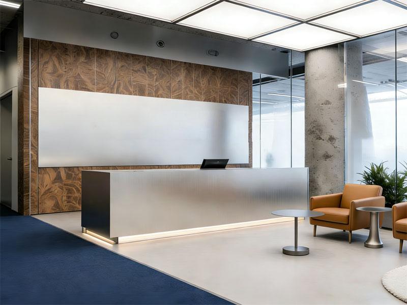 前台区域以胡桃木纹理饰面板与拉丝金属前台形成冷暖碰撞,大面积留白的金属墙面预留品牌展示位,搭配嵌入式灯带与通透玻璃隔断,既保证了空间的开阔感,又传递出沉稳专业的企业形象。开放办公区则延续了极简风格,金属墙板与玻璃隔断划分出清晰的功能边界,格栅顶灯与自然采光相互补充,让光线均匀覆盖每一个工位,在保证高效协作的同时,避免了封闭空间的压抑感。